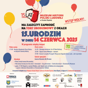 W sobotę, 14 czerwca, Muzeum Historii Polski Ludowej w Rudzie Śląskiej świętuje 15-lecie istnienia. Na gości czeka darmowe zwiedzanie, urodzinowy tort, koncerty, warsztaty i specjalni goście – m.in. Joanna Helander i Bo Persson. To będzie wyjątkowa okazja, by przenieść się w czasie i spojrzeć na PRL z perspektywy historii, sztuki i kultury.