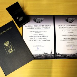 Przewodnicząca Komisji Kultury i Promocji m.st. Warszawy Agnieszka Wyrwał w imieniu Rady m.st. Warszawy wręczyła „Odznaki Honorowe Zasłużonego dla Warszawy” Teatrowi Hybrydy oraz jego dyrektorowi Maciejowi Dzięciołowskiemu.
