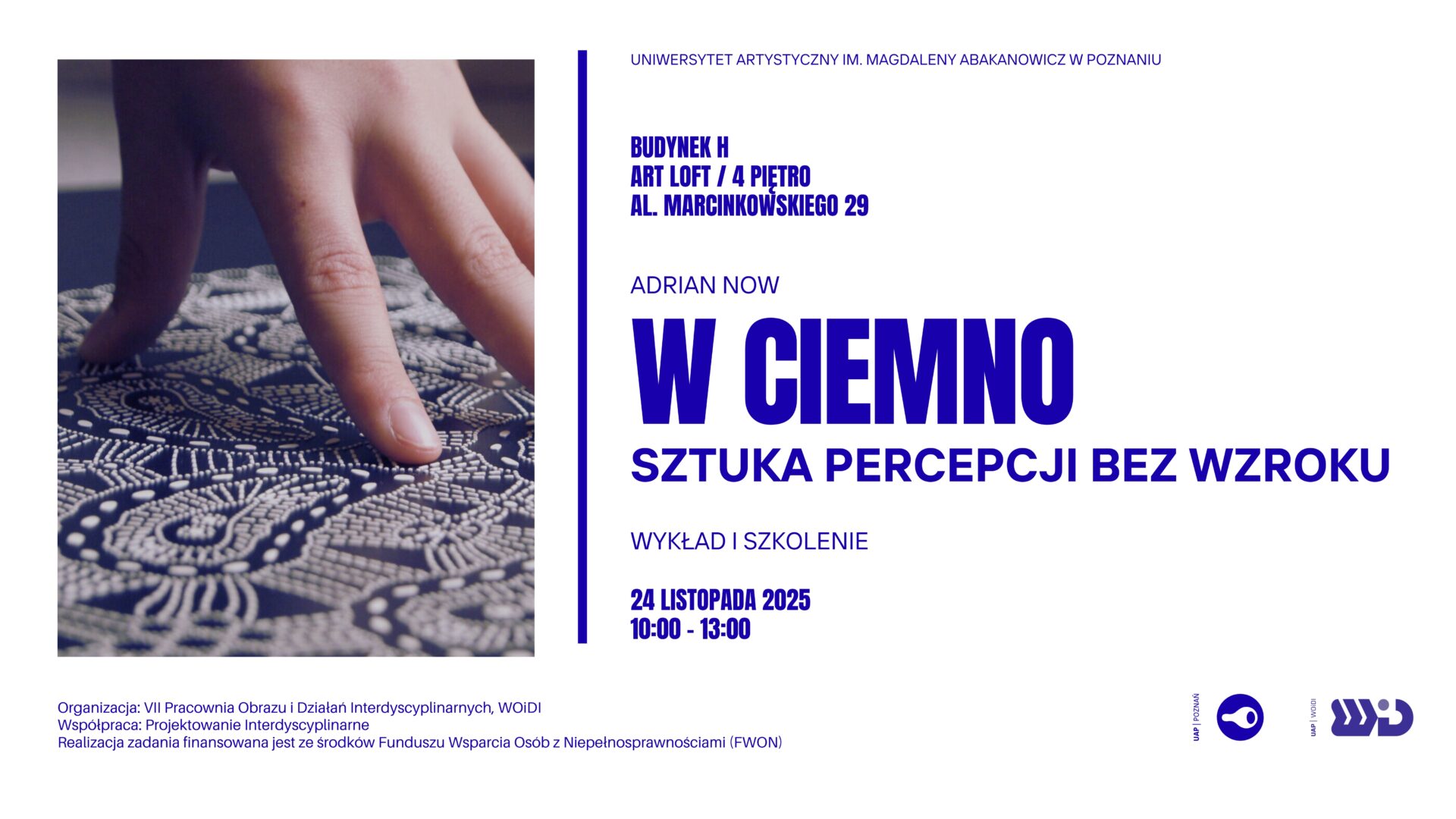 Serdecznie zapraszamy osoby studenckie na wykład i szkolenie, które poprowadzi pan Adrian Now – twórca projektu W Ciemno, działającego na rzecz dostępności i edukacji osób niewidomych. Adrian Now jest ambasadorem osób z niepełnosprawnością wzroku, edukatorem i mówcą motywacyjnym. W swoich działaniach podkreśla, iż „ograniczenia istnieją tylko w naszych umysłach” oraz iż technologia i świadomość społeczna pozwalają niwelować bariery percepcyjne. Jego udział w programie pozwoli osobom studiującym poznać perspektywę osoby niewidomej z autopsji i zrozumieć rzeczywisty kontekst tworzenia sztuki dostępnej.