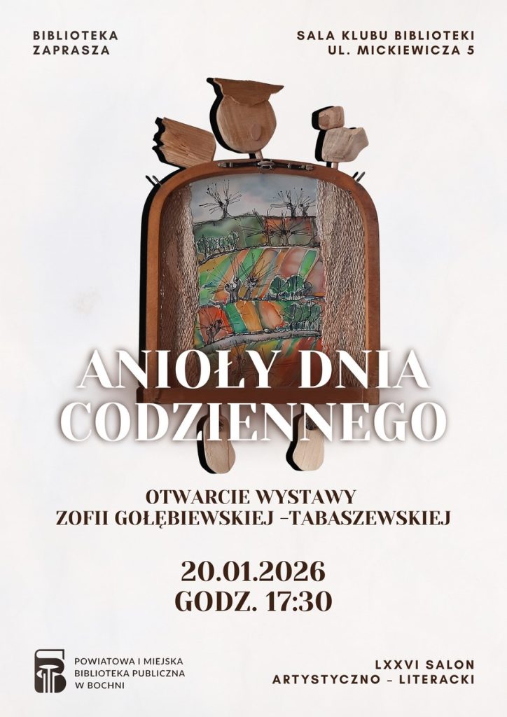 Powiatowa i Miejska Biblioteka Publiczna w Bochni zaprasza we wtorek 20 stycznia o godz. 17:30 na LXXVI Salon Artystyczno-Literacki i otwarcie wystawy Zofii Gołębiewskiej-Tabaszewskiej „Anioły dnia codziennego”.
