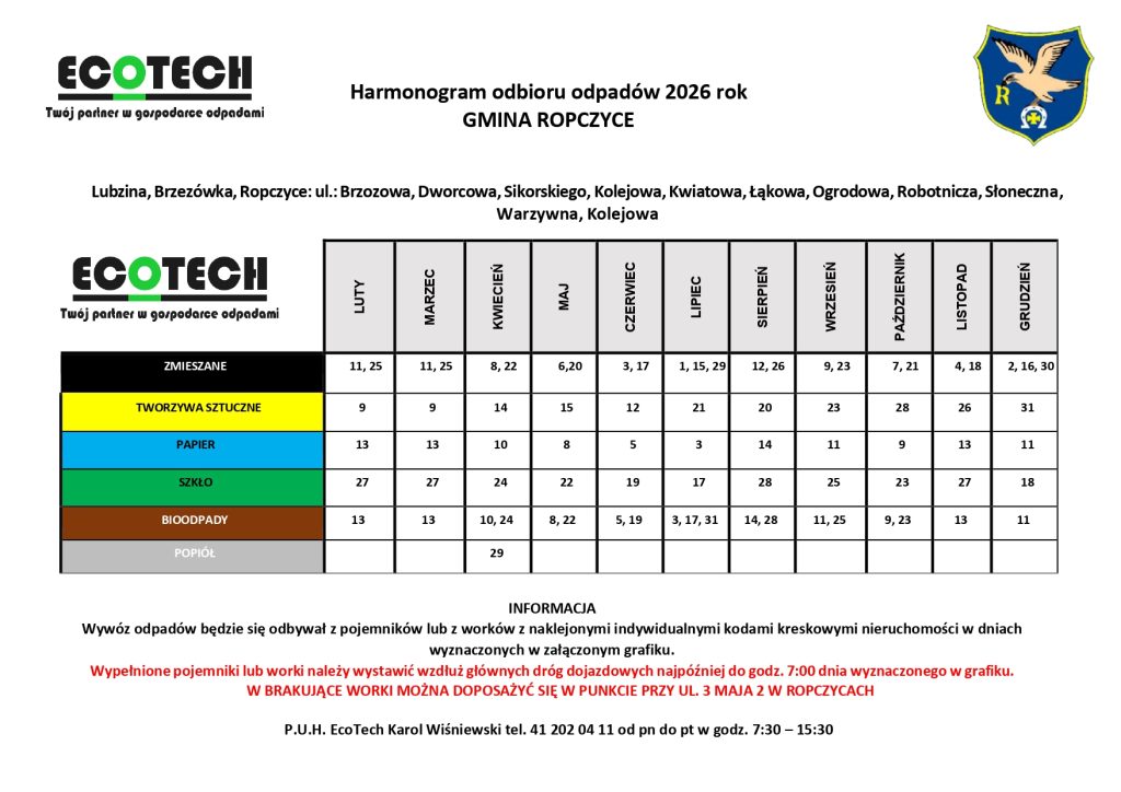 23 stycznia 2026 roku Burmistrz Ropczyc podpisał umowę z Przedsiębiorstwem Usługowo-Handlowym Eco-Tech Karol Wiśniewski ze Stopnicy, które wygrało przetarg na odbiór i zagospodarowanie odpadów komunalnych na terenie Gminy Ropczyce. Nowa umowa obowiązywać będzie od lutego do końca 2026 roku.