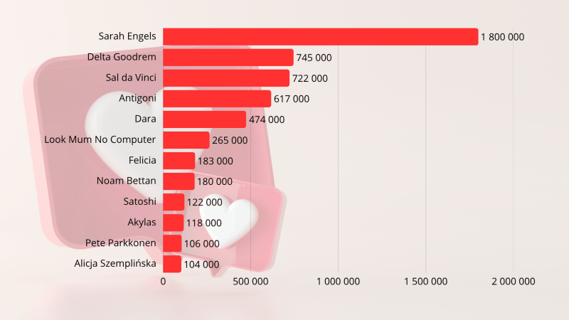 Warto zwrócić uwagę na Antigoni – wokalistka reprezentująca Cypr, która tak naprawdę mieszka w Wielkiej Brytanii. Stawia na muzykę, ale kojarzy ją się głównie z „Love Island” i pewnie stąd ma tak pokaźne grono followersów. Na Instagramie 617 tysięcy (4. miejsce), na TikToku 610 tysięcy (3. miejsce). Popularnością cieszy się też Dara z Bułgarii, której profil na Instagramie śledzi 474 tysiące osób (5. miejsce), a na TikToku 351 tysięcy (4. miejsce).