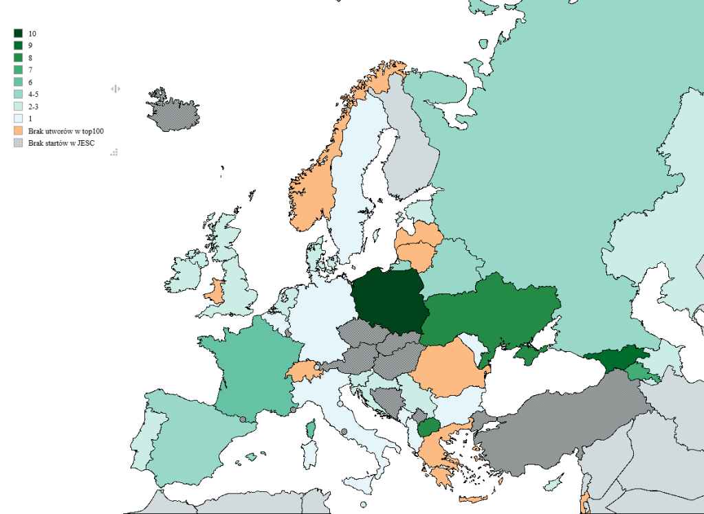 Ponieważ jest to polski plebiscyt, nie ma się co dziwić, iż aż 10 piosenek spośród 100 to utwory, które Polska wysyłała na Eurowizję Junior. W tegorocznym zestawieniu zabrakło jedynie formacji KWADro (2004) i Dominika Arima (2024), który rok temu zadebiutował na pozycji 44, a w tym roku zabrakło mu głosów, by znaleźć się w najlepszej setce. Drugie miejsce wśród najpopularniejszych państw ma Gruzja (9 piosenek), trzecie Macedonia z Ukrainą (po 8 piosenek). Dalej mamy Armenię (7), Francję (6), Hiszpanię z Rosją (po 5), Białoruś (4) i Holandię (3). Po dwa utwory mają Kazachstan, San Marino, Chorwacja, Malta, Irlandia, Dania, Serbia, Wielka Brytania, Azerbejdżan, Słowenia, Portugalia, Estonia oraz Cypr, a po jednym Niemcy, Czarnogóra, Włochy, Bułgaria, Mołdawia, Belgia, Australia, Szwecja i Albania. Bez żadnego utworu w notowaniu pozostały Rumunia (7 startów), Grecja (6 startów), Łotwa (5 startów), Litwa (4 starty), Norwegia i Izrael (po 3 starty), Walia (2 starty), Serbia i Czarnogóra jako konfederacja oraz Szwajcaria (po jednym starcie).