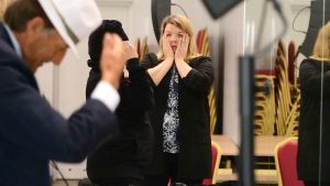 Już w scenie „Przygotowanie” ujawnia się symboliczny wymiar całego przedstawienia. To właśnie tutaj teatr odsłania swoje drugie dno – staje się przestrzenią odbicia rzeczywistości, prawdy o ludzkich zachowaniach i współczesnych czasach. Scena rozgrywa się przed lustrem, które staje się nie tylko elementem scenografii, ale też metaforą samopoznania i społecznego zwierciadła. Wybór przebrania – pończocha czy kominiarka – zyskuje tu wymiar symboliczny, nawiązując do współczesnych dylematów związanych z wizerunkiem, maską i sposobem, w jaki prezentujemy się w świecie mediów.