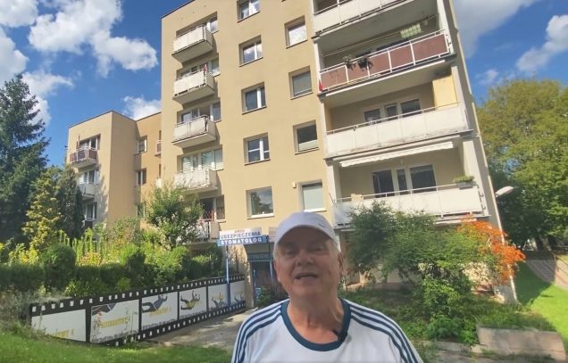 Sławomir Szeliga przed blokiem z serialu „Alternatywy 4”.