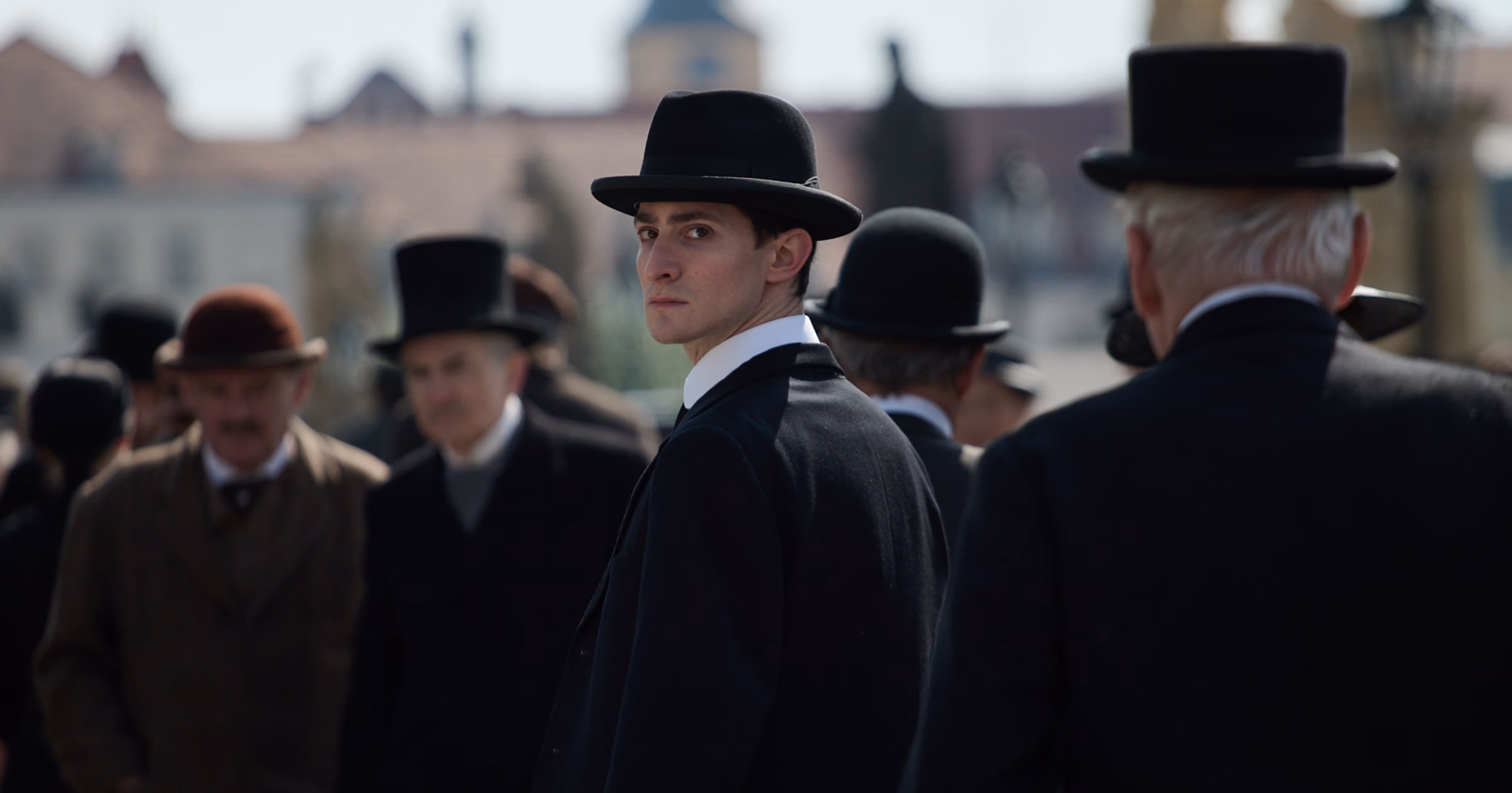 fot. kadr z filmuW tej niespójnej i nadmiernie skomplikowanej narracji znaleźć można oczywiście wiele pozytywów. Idan Weiss w roli Franza Kafki to zdecydowanie strzał w dziesiątkę. Aktor idealnie odzwierciedlił nieśmiałość i lęki głównego bohatera. Jednocześnie to uroczy, nietuzinkowy chłopak, którego losy po prostu chciało się śledzić. Tutaj również należy się pochwała dla samej Holland, która dobrze poprowadziła aktora i zachowała spójność w jego charakterze. W oczach postaci było widać zamknięte w umyśle tajemnice i analizy. Jednocześnie Weiss zbudował genialne relacje z pozostałymi bohaterami. W szczególności wątek dominacji ojca Kafki ubogacał jego historię i psychologię. Nie mniej skuteczna okazała się również chemia bohatera w relacjach z kobietami, czy jego przyjaźń z Maxem Brodem.
