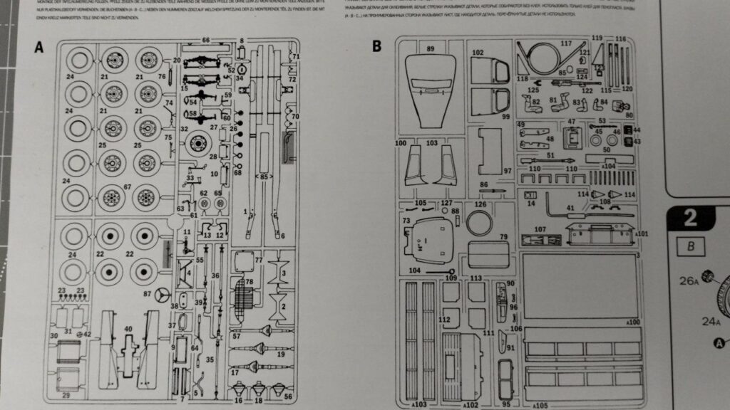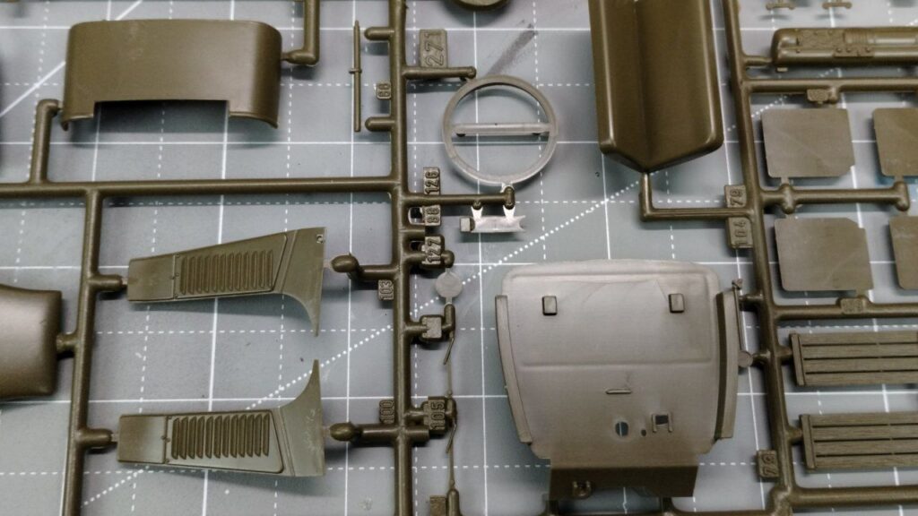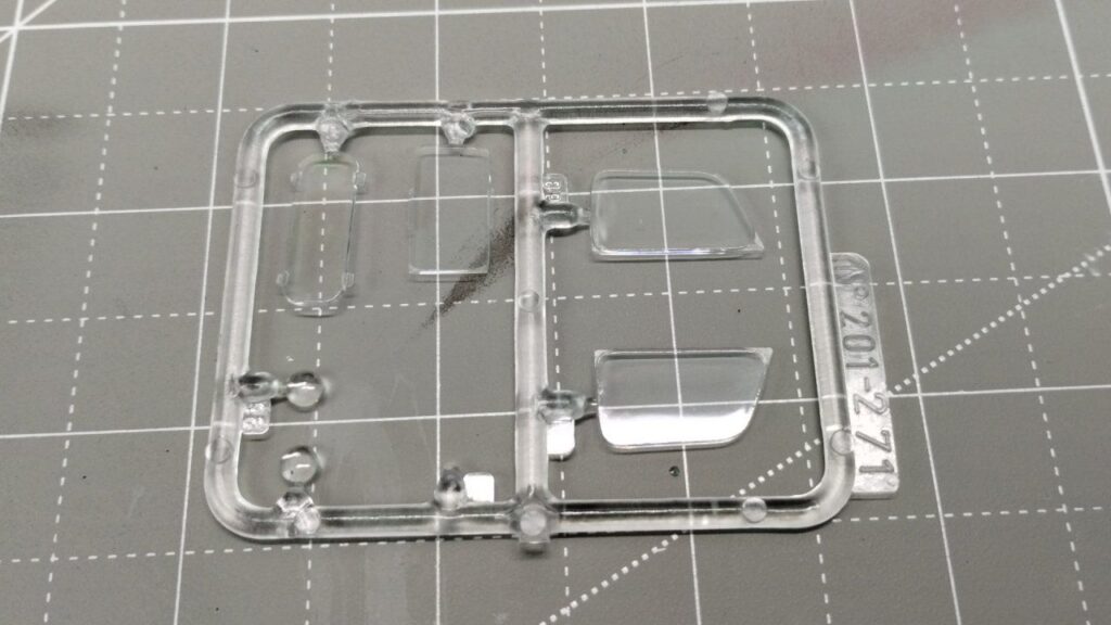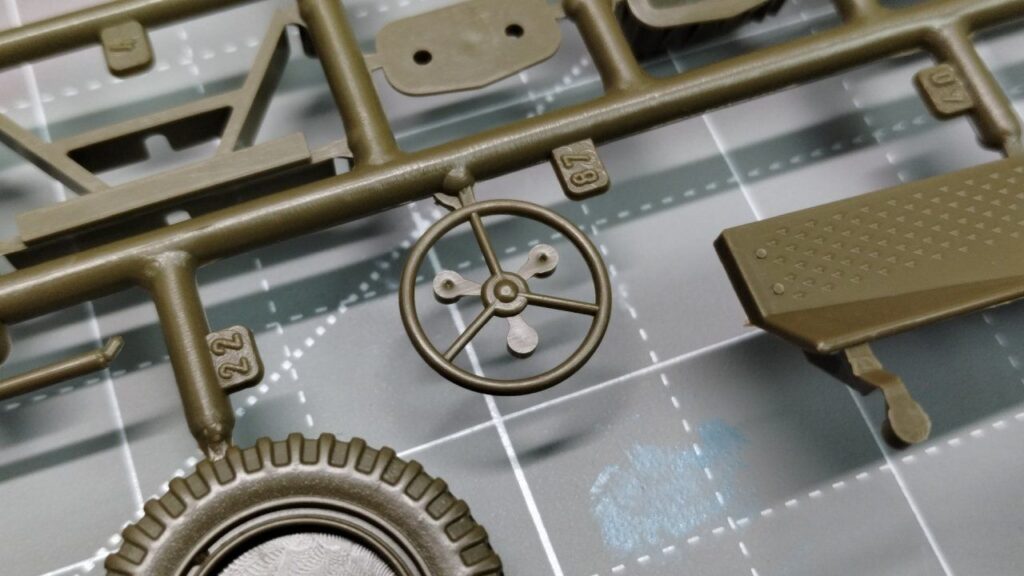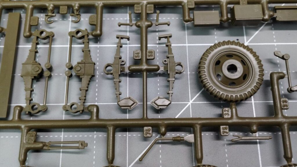 Druga wypraska to głównie elementy podwozia, układu napędowego i zawieszenia. Znajdziemy tu również przedni zderzak, koła, kierownicę, chłodnicę i opony (które trzeba będzie trochę podszlifować, żeby nie było widać linii łączenia). Jakość obu wyprasek stoi na przyzwoitym poziomie, choć widać, iż nie jest to górna półka. Oprócz tych dwóch wyprasek znajdziemy jeszcze ramkę z elementami przezroczystymi, gdzie znajdują się szyby przednie i boczne oraz klosze na reflektory.