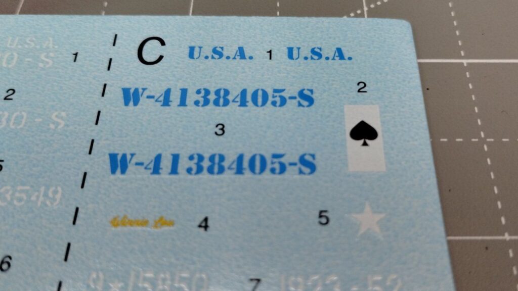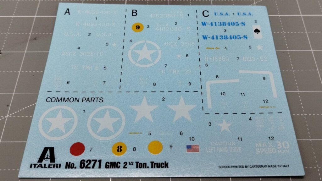 Jak już plastikowe elementy mamy za sobą, to teraz można przyjrzeć się arkuszowi z kalkomanią, gdzie jest sporo opcji do wyboru. Sporo, czyli dokładnie 3. Sam arkusz jest podzielony na część A, B i C, które zawierają oznaczenia odpowiednie dla różnych wersji i dodatkowo na arkuszu znajdziemy też kalkomanie wspólne dla wszystkich 3 wariantów.
