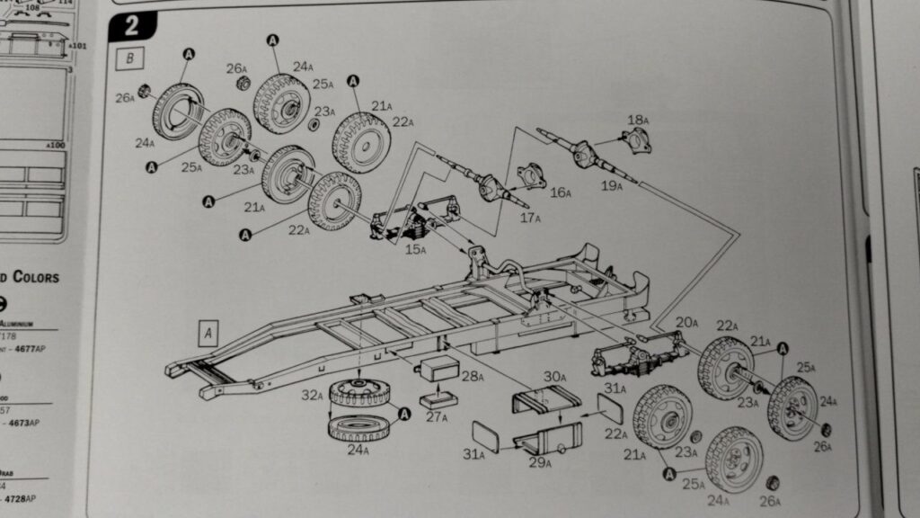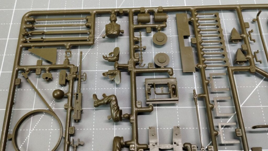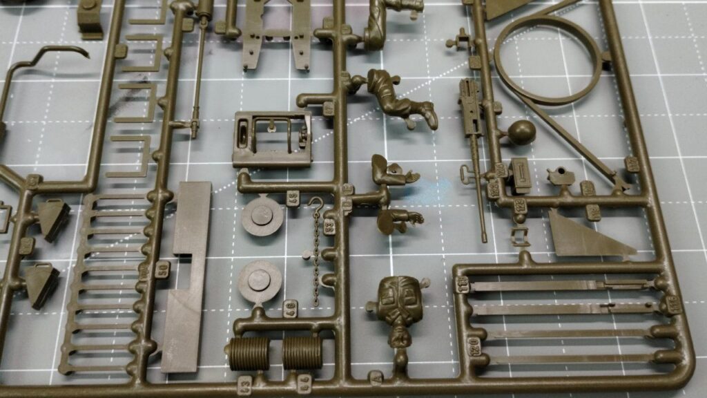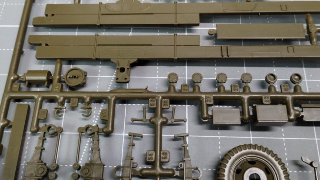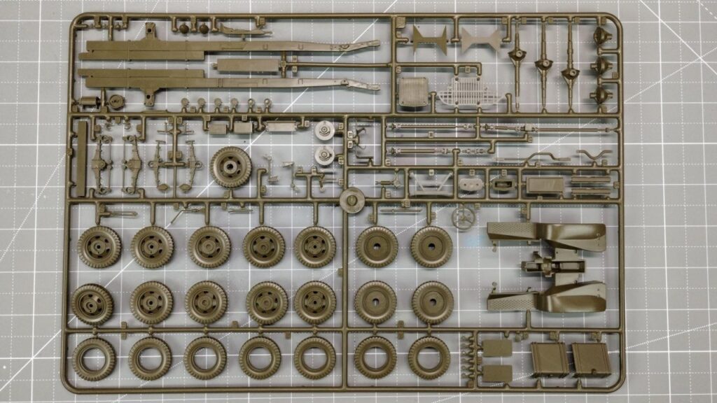 Niestety sam model, to po prostu zwykły „przepak” z klasycznego wydania modelu GMC 2,5 ton. 6×6 truck zapakowany w jubileuszowe pudełko. Tu Italeri się nie popisało. Jakby tego było mało, w moim egzemplarzu brakowało elementu przezroczystego, który ma znaleźć się na miejscu przedniej szyby. W pudełku nie znajdziemy zbyt dużo wyprasek, bo zaledwie 2 i dodatkowo jedna ramka z elementami przezroczystymi. o ile chodzi o skalę trudności, to model w 5-cio stopniowej skali jest opisywany, jako 3. Przy takiej ilości elementów i ich wielkości myślę, iż skala trudności 3, to zdecydowanie zbyt dużo (ale to jeszcze zobaczę podczas budowy).