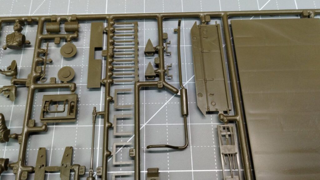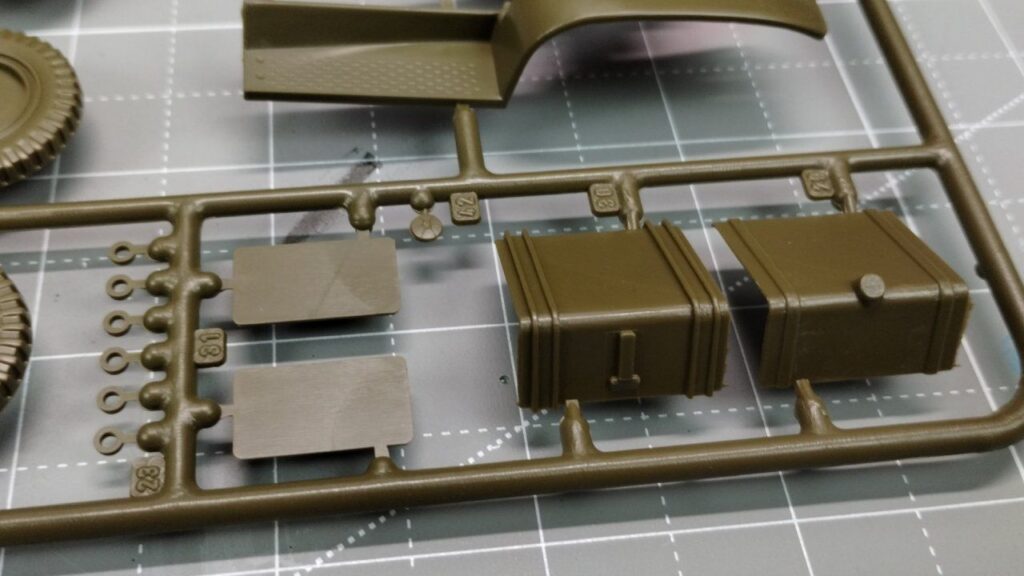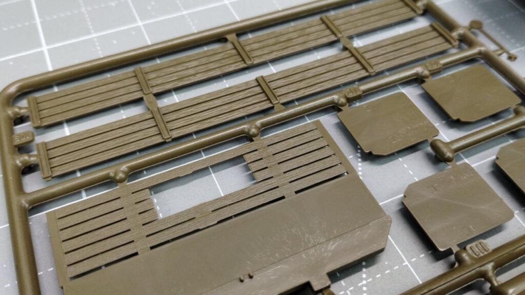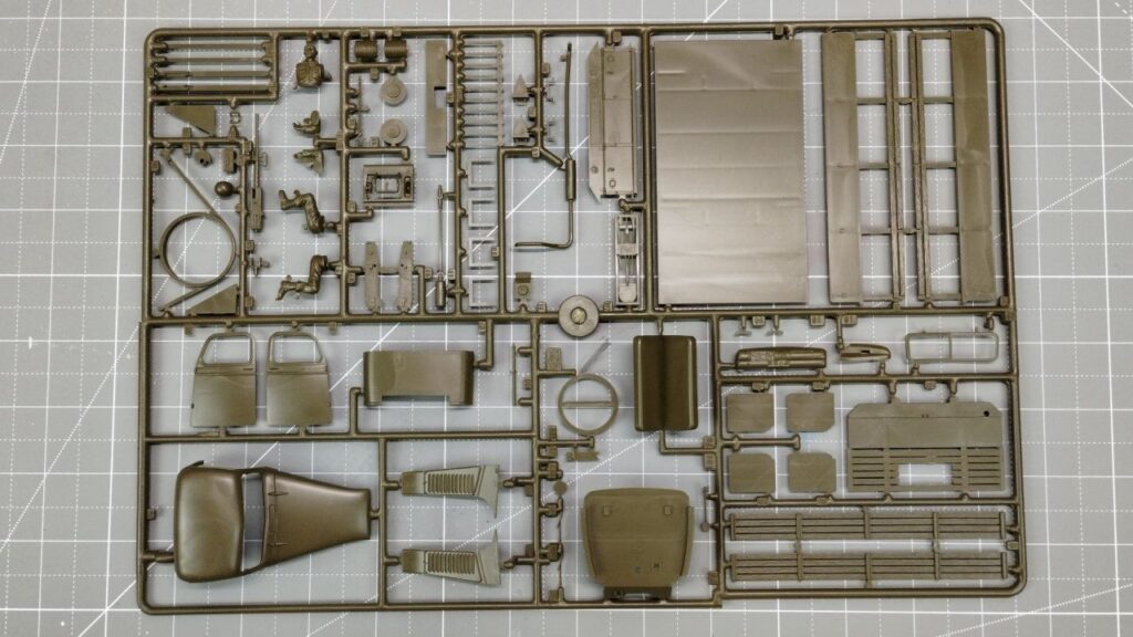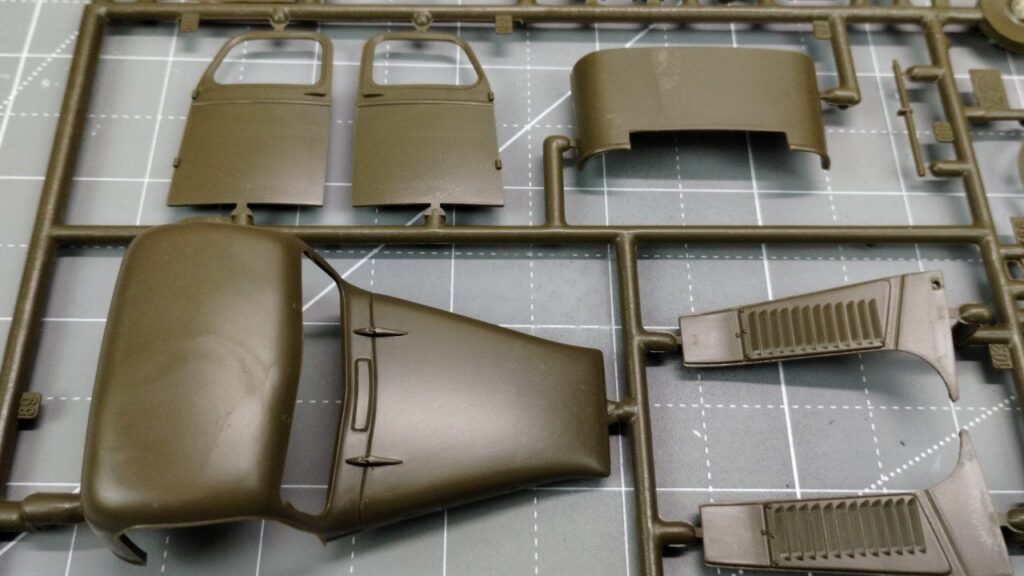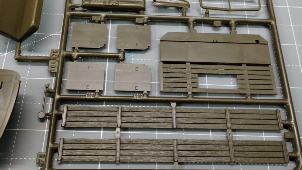 W jednej z wyprasek znajdują się elementy karoserii oraz nadwozia, chociaż nie ma tu podziału na nadwozie i podwozie. Oprócz elementów karoserii i całej paki, w tej wyprasce znalazł się również układ wydechowy, deska rozdzielcza, kanapa kierowcy, oraz figurka kierowcy. Podoba mi się to, iż w elementach do budowy paki bardzo dobrze odtworzono imitację drewna. Przy malowaniu będzie można wyciągnąć dodatkowy detal.