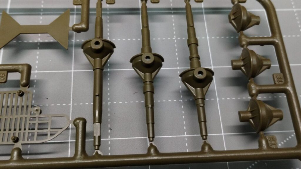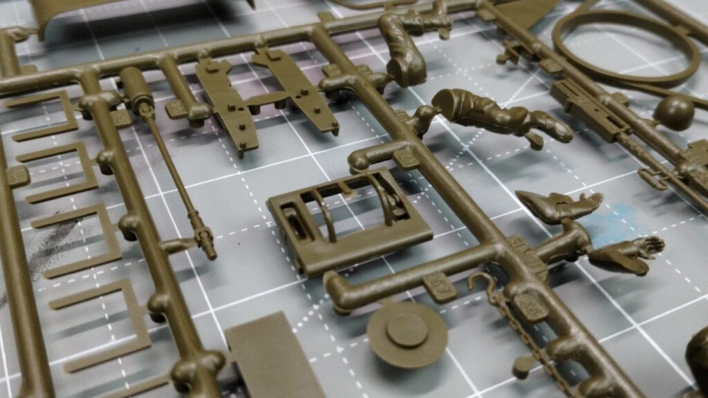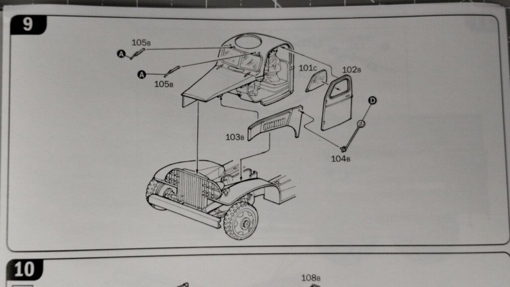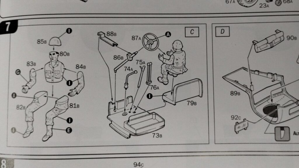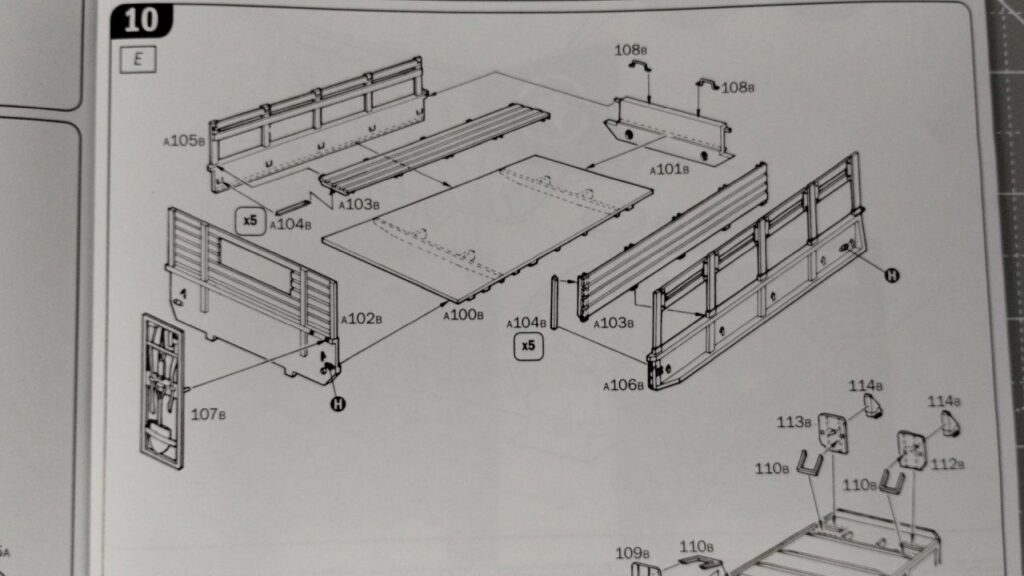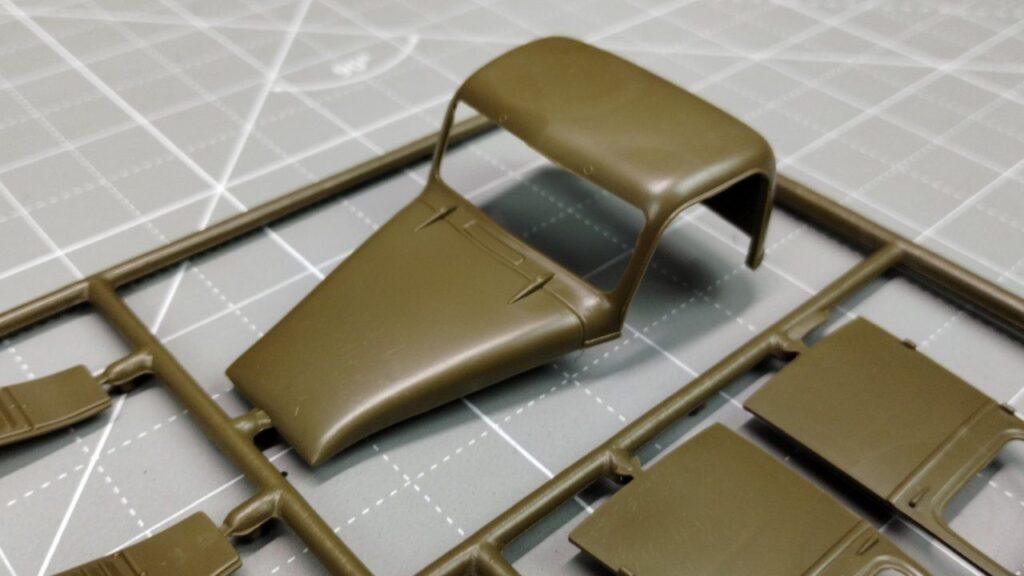 W jednej z wyprasek znajdują się elementy karoserii oraz nadwozia, chociaż nie ma tu podziału na nadwozie i podwozie. Oprócz elementów karoserii i całej paki, w tej wyprasce znalazł się również układ wydechowy, deska rozdzielcza, kanapa kierowcy, oraz figurka kierowcy. Podoba mi się to, iż w elementach do budowy paki bardzo dobrze odtworzono imitację drewna. Przy malowaniu będzie można wyciągnąć dodatkowy detal.