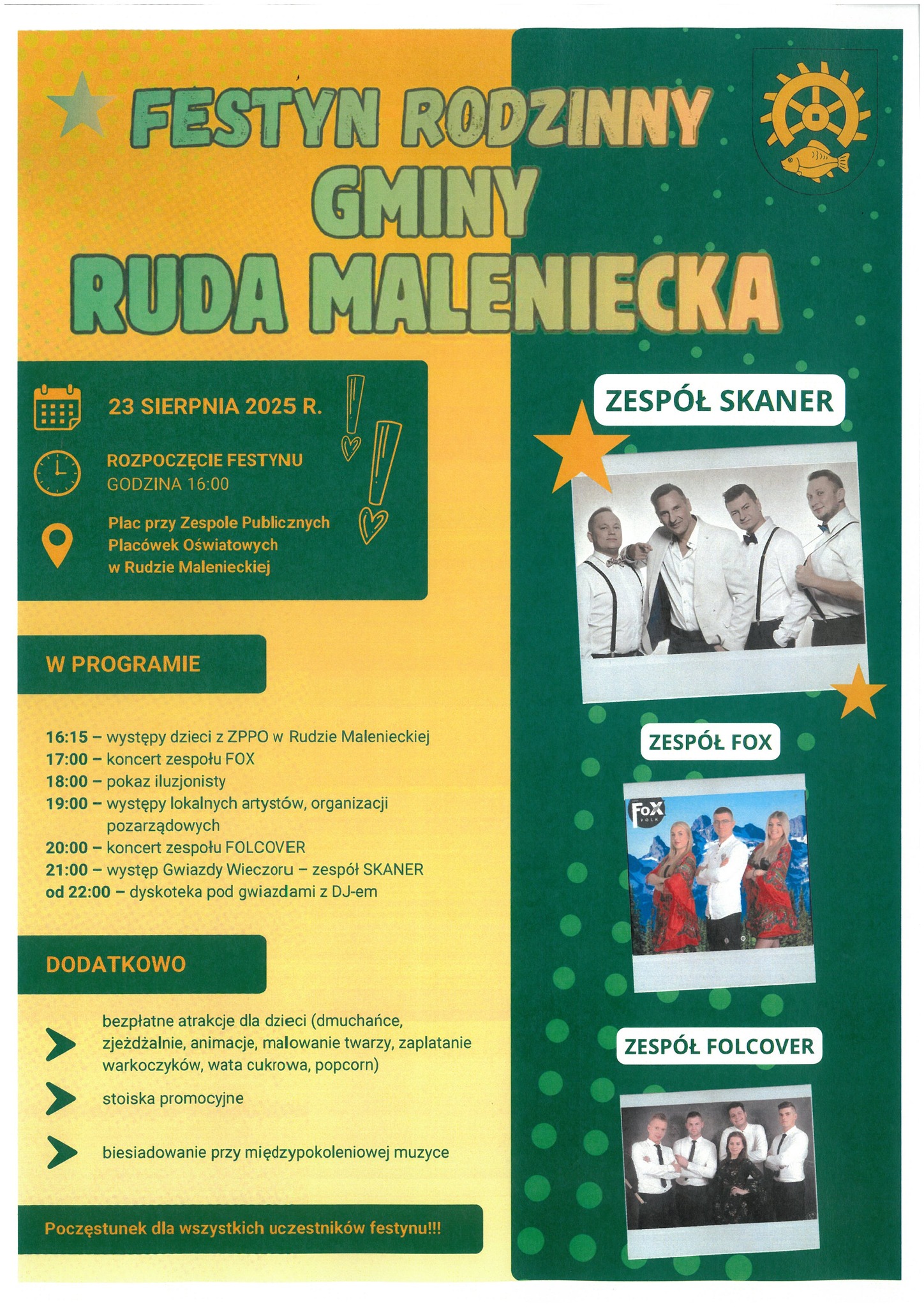 Zespół SKANER pojawił się na scenie muzycznej w 1993. Wokalista Robert Sasinowski działał wcześniej w grupie Boys. W połowie lat 90′ cała Polska śpiewała już hity Skanera. Kolejny wokalista disco-polo, który wystąpi podczas Dni Gminy Ruda Maleniecka jest Fox z Kielc. Najpopularniejszy kawałek muzyka to Zaskakująca, zebrał na YouTubie 4 miliony wyświetleń. Ponadto podczas festynu w Rudzie Malenieckiej wystąpi też zespół Folcover, który wykonuje covery muzyki rozrywkowej.