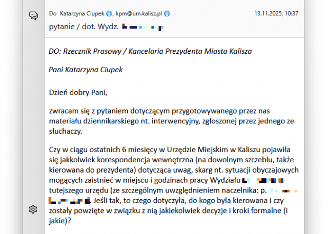 rc.fm / tel. 62. 503 11 99) zadaliśmy pytania o mocno nieobyczajne zdarzenie w jednym z wydziałów kaliskiego ratusza, do którego miało prawdopodobnie dojść w służbowym gabinecie w godzinach pracy. W rolach głównych – wg informatora - wystąpić mieli naczelnik jednego z wydziałów i pracownica urzędu. I właśnie przyszła odpowiedź.
