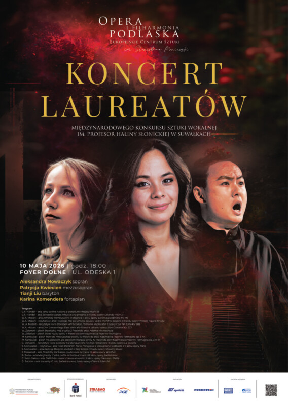Kolejny koncert kameralny w Operze i Filharmonii Podlaskiej odbędzie się 10 maja. W przestrzeni dolnego foyer Opery przy ul. Odeskiej 1 zaplanowany jest Koncert Laureatów Międzynarodowego Konkursu Sztuki Wokalnej im. Profesor Haliny Słonickiej w Suwałkach. Wystąpią młodzi, utalentowani soliści: Aleksandra Nowaczyk, Patrycja Kwiecień oraz Tianji Liu, którym przy fortepianie towarzyszyć będzie Karina Komendera. Program wieczoru obejmie zarówno pieśni, jak i arie operowe kompozytorów takich jak Władysław Żeleński, Mieczysław Karłowicz, Georg Friedrich Händel, Wolfgang Amadeus Mozart, Stanisław Moniuszko czy Giacomo Puccini. Początek o godz. 18.00.