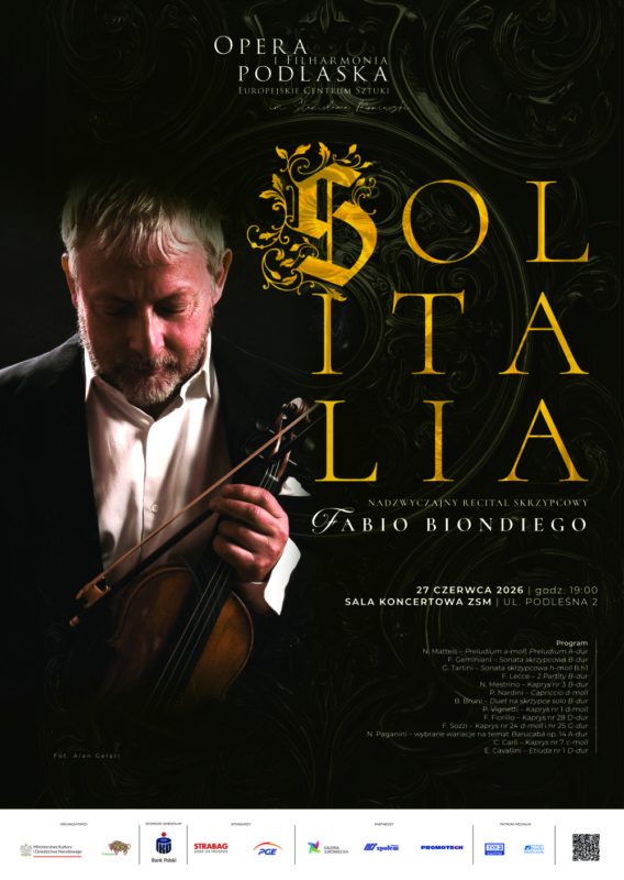 Fabio Biondi to światowej sławy włoski skrzypek i dyrygent, ceniony interpretator muzyki dawnej, który darzy szczególnym uznaniem twórczość Stanisława Moniuszki. To on jako pierwszy zaprezentował włoską wersję dzieła Moniuszki w formie koncertowej (w 2018 r. na Międzynarodowym Festiwalu Muzycznym „Chopin i jego Europa” w Warszawie), czego efektem było także powstanie albumu CD z udziałem m.in. artystów Chóru Opery i Filharmonii Podlaskiej. w tej chwili artysta współpracuje z OiFP przy realizacji scenicznej wersji opery Halka, której prapremiera włoskiej wersji językowej odbędzie się w Białymstoku 15 maja. Fabio Biondi poprowadzi również artystów podczas koncertu wieńczącego sezon artystyczny 2025/2026. Publiczność usłyszy Bal maskowy Giuseppe Verdiego w wersji koncertowej w międzynarodowej obsadzie.