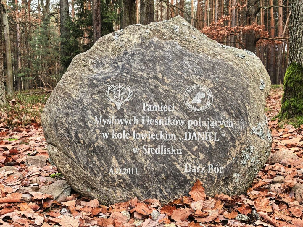 Pełna nazwa tytułowego obiektu brzmi: Pamięci Myśliwych i Leśników polujących w Kole Łowieckim DANIEL w Siedlisku”. Ufundowano go w 2011 r. wspólnym sumptem obu społeczności dla uczczenia pamięci zmarłych członków koła.