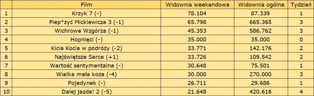 Numerem jeden minionego weekendu w polskich kinach był Krzyk 7. Horror zgromadził podczas premierowego weekendu 78 104 widzów, co oznacza najlepsze otwarcie w serii. Wynik ten jest nieco wyższy od tego, który trzy lata temu odnotował poprzednik (74 tys.).