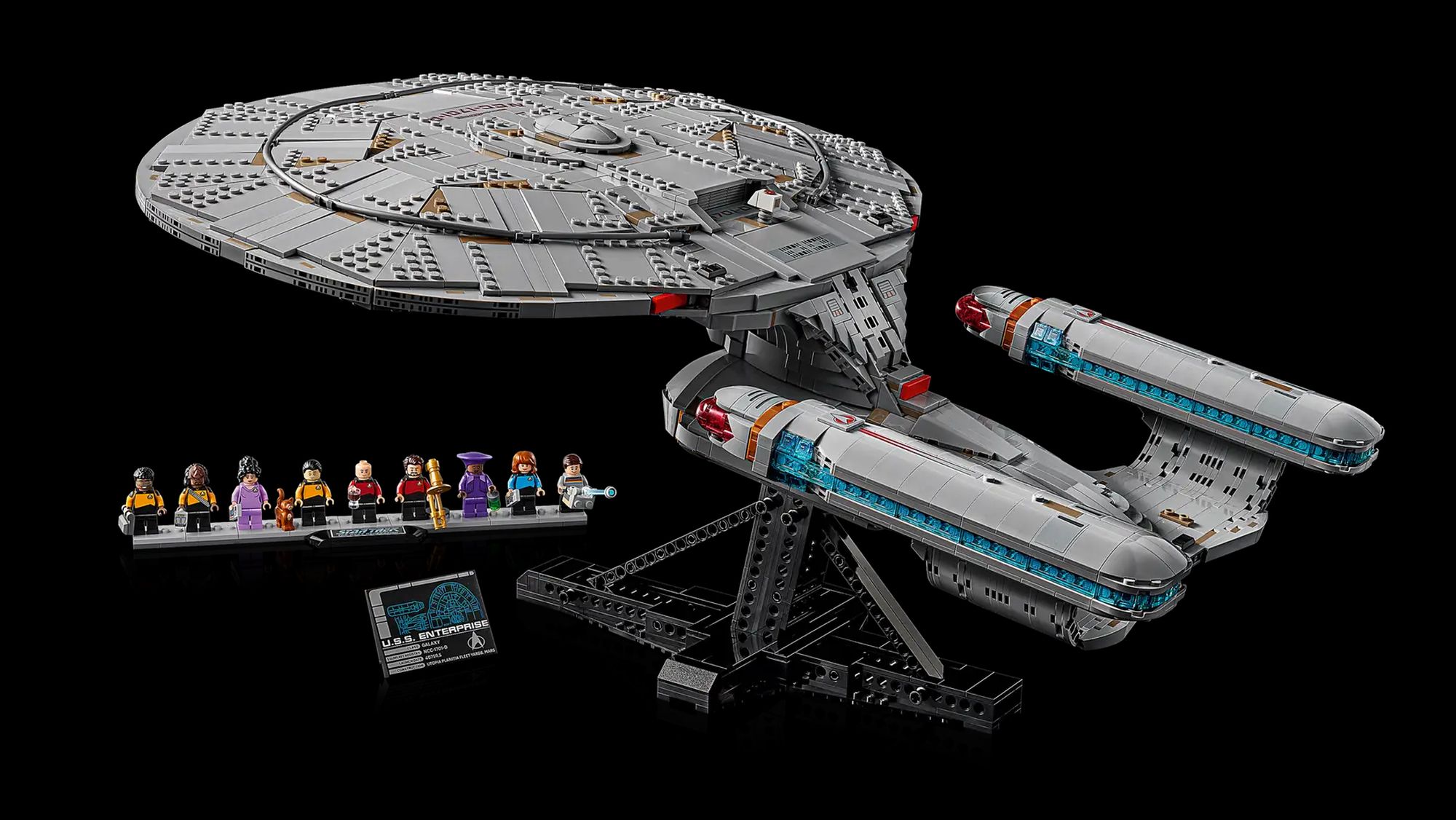 LEGO nie oszczędzało na minifigurkach. Dostajemy kompletną obsadę mostka: Picarda, Rikera, Troi, Worfa, La Forge’a, Datę, Dr. Crusher, a choćby Wesleya (w jego słynnym sweterku) i Guinan.