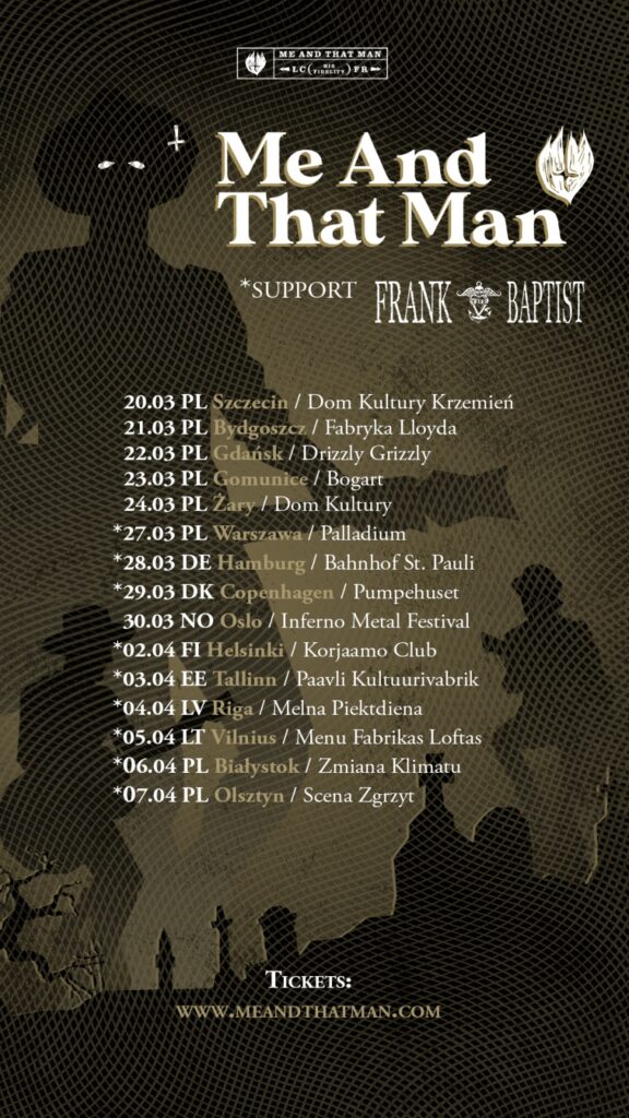 Właśnie poznaliśmy szczegóły przyszłorocznej trasy koncertowej zespołu Me and That Man. Tournée obejmie zarówno koncerty w Polsce, jak i za granicą. Dowodzona przez Nergala formacja pierwszy występ da 20 marca w Szczecinie, a wszystko zakończy się 7 kwietnia w Olsztynie. W międzyczasie grupa pojawi się w Niemczech, Finlandii czy Estonii.