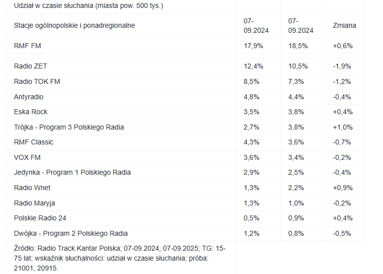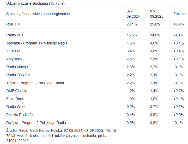 Najnowsza fala badań Radio Track (lipiec-wrzesień 2025) pokazuje wzrost udziału w czasie słuchania Radia RMF FM w stosunku do analogicznej fali w roku ubiegłym. Stacja posiada 29,0 proc. udziału i zdecydowanie wyprzedza kolejne w rankingu Radio ZET – ta stacja zanotowała spadek. Z kolei wzrosty odnotowały m.in. VOX FM, RMF Classic i Radio Wnet.