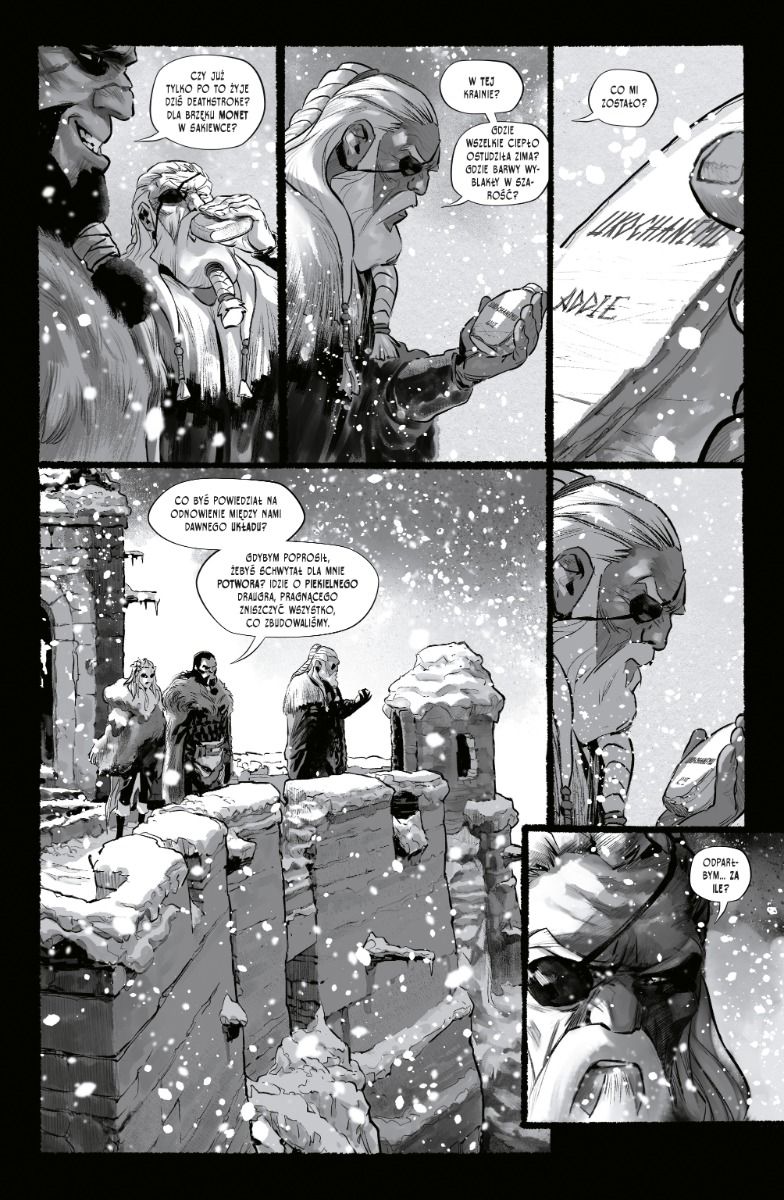 Nie oznacza to jednak, iż Mroczni Rycerze ze stali: Wszechzima jest komiksem wolnym od problemów. Największy z nich dotyczy samej logiki świata przedstawionego, a dokładniej tego, jak komiks traktuje przemoc i śmierć. Z jednej strony dostajemy brutalne, wikińskie realia. Z drugiej bardzo gwałtownie okazuje się, iż obowiązują one głównie bohaterów drugiego i trzeciego planu. jeżeli nie jesteś istotną postacią, to zginiesz normalnie. jeżeli jesteś kimś istotnym dla fabuły, możesz zostać nabity na ostre drzewo czy dostać toporem w plecy, a i tak będziesz w stanie dalej normalnie funkcjonować. Co więcej, często choćby nie widać realnych obrażeń. I właśnie to najmocniej wybija z rytmu. Trudno w pełni wejść w opowieść o brutalnym świecie, kiedy ten świat nagle zaczyna działać według bardzo wygodnych, komiksowych zasad.