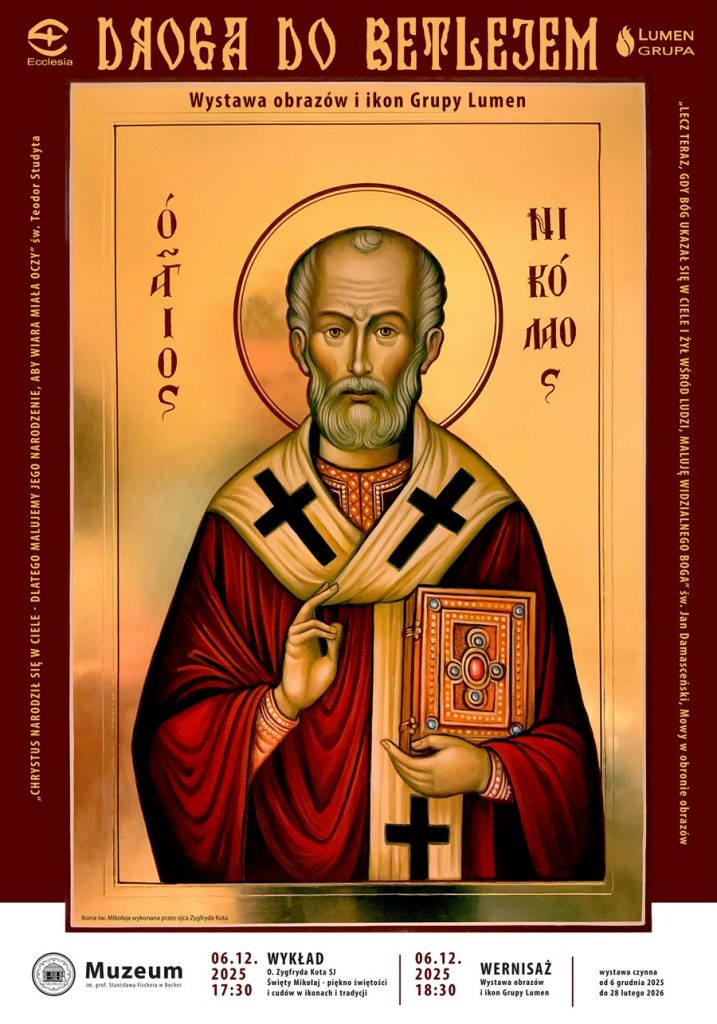 Muzeum im. prof. Stanisława Fischera w Bochni zaprasza w sobotę 6 grudnia na 24. Bocheński Dzień Świętego Mikołaja, który rozpocznie o godz. 17:30 wykład „Święty Mikołaj – piękno świętości i cudów w ikonach i tradycji” O. Zygfryda Kota SJ. Na godz. 18:30 zaplanowano wernisaż „Droga do Betlejem” Grupy Lumen, a na godz. 19:00 wizytę św. Mikołaja.