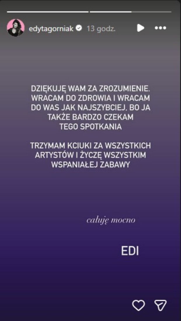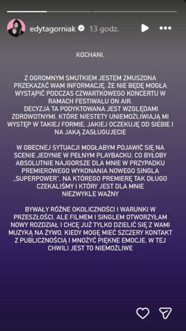 „Decyzja ta podyktowana jest względami zdrowotnymi, które niestety uniemożliwiają mi występ w takiej formie, jakiej oczekuję od siebie i na jaką zasługujecie. W obecnej sytuacji mogłabym pojawić się na scenie jedynie w pełnym playbacku, co byłoby absolutnie najgorsze dla mnie w przypadku premierowego wykonania nowego singla "Superpower", na którego premierę tak długo czekaliśmy i który jest dla mnie niezwykle ważny” – napisała Górniak w mediach społecznościowych.