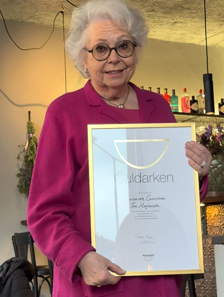 Księżniczka Christina otrzymała nagrodę Guldarkena za wieloletnie zaangażowanie w pracę przeciwko HIV i AIDS jako wiceprzewodniczący Czerwonego Krzyża. "Najsilniejszym wspomnieniem, jakie mam z mojego czasu jako członek zarządu Noaks Ark-Red Cross, jest uczucie ciepła i miłości, które płynęły w kierunku odwiedzających w budynku na Drottninggatan, w którym wtedy działała organizacja. Pomimo trudnej i niepokojącej sytuacji, w której wielu się znalazło, było to coś, co wyróżniało wszystkich pracowników, wolontariuszy i gości. Dlatego odbieram wspaniałą nagrodę, którą Noaks Ark wręcza z wielką wdzięcznością..