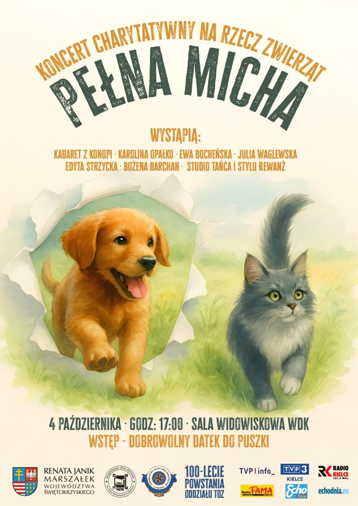 Koncert „Pełna Micha” to artystyczna inicjatywa, której celem jest pomoc zwierzętom pod opieką TOZ Kielce, a także uczczenie Światowego Dnia Zwierząt oraz 100-lecia działalności Towarzystwa Opieki nad Zwierzętami w Kielcach.