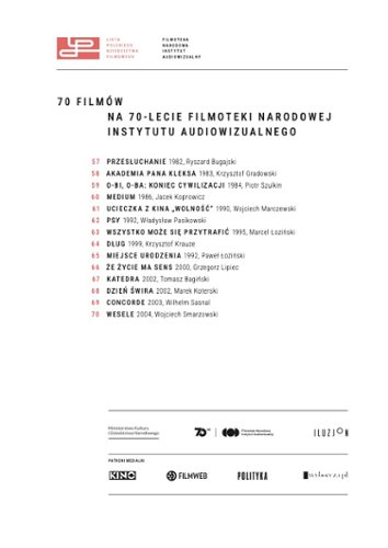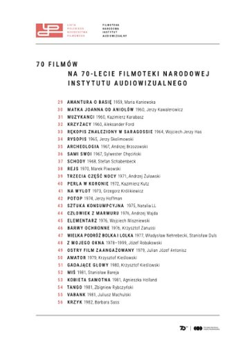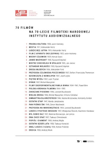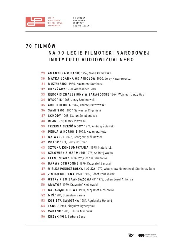 Wszystkie 70 tytułów tworzących Listę Polskiego Dziedzictwa Filmowego załączamy w formie grafiki poniżej. Aby ją powiększyć, wystarczy kliknąć na wybraną grafikę. Pełna Lista wraz z opisami filmów jest także dostępna na:fina.gov.pl/lpdf