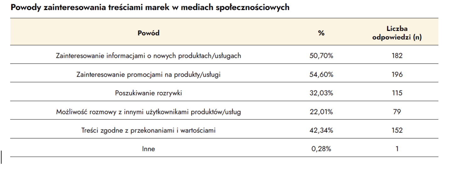 Najsilniejszym magnesem przyciągającym odbiorców do treści publikowanych przez marki są promocje – wskazało je prawie 55% badanych. Niemal równie duże zainteresowanie budzą informacje o nowych produktach i usługach, które przyciągają 51% respondentów. To jasny sygnał dla marketerów: użytkownicy chcą wartości dodanej, konkretnych korzyści i świeżych informacji, które pomagają im podejmować decyzje zakupowe.