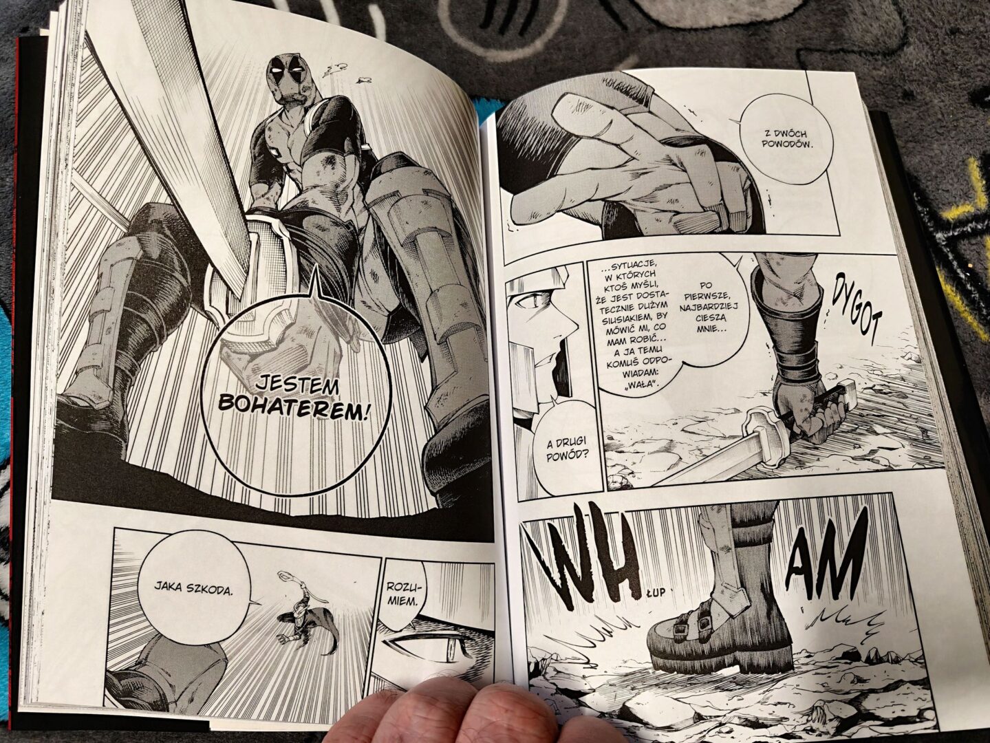 Rysunki Uesugiego to osobny atut. Styl jest jednoznacznie mangowy, wyraźne linie ruchu, przerysowana mimika, dynamiczne splash page’e. Jednak projekt samego Deadpoola zachowuje jego zachodnią tożsamość. Ta wizualna hybryda działa zaskakująco naturalnie. Co ważne, humor jest tu mniej wulgarny niż w wielu amerykańskich seriach z tą postacią, co czyni mangę przystępniejszą dla młodszych czytelników, bez utraty charakterystycznej bezczelności.