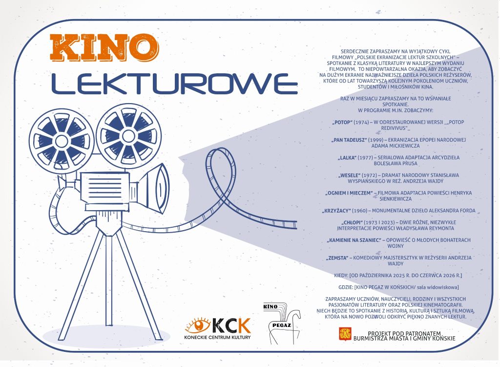 Każdego miesiąca w tym roku szkolnym organizowany będzie jeden seans kina lekturowego. W razie dużego zainteresowania szkół liczba projekcji może wzrosnąć. Listę planowanych do wyświetlania filmów znajdziecie na grafice poniżej: