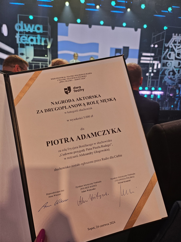 Nagrodę aktorską za drugoplanową rolę męską w kategorii słuchowisk w imieniu Piotra Adamczyka odebrała reżyserka słuchowiska i dyrektor literacka RDC Aleksandra Głogowska.