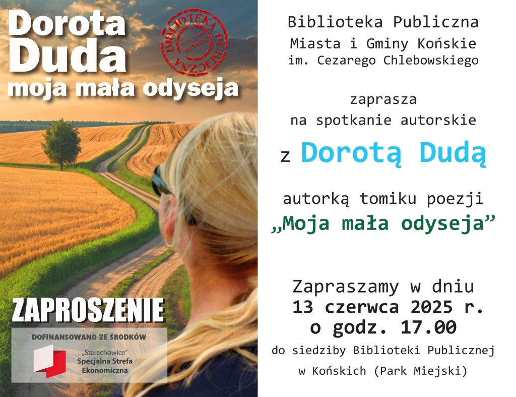 Biblioteka Publiczna Miasta i Gminy Końskie im. Cezarego Chlebowskiego zaprasza na spotkanie autorskie z Dorotą Dudą, autorką tomiku poezji „Moja mała odyseja”.