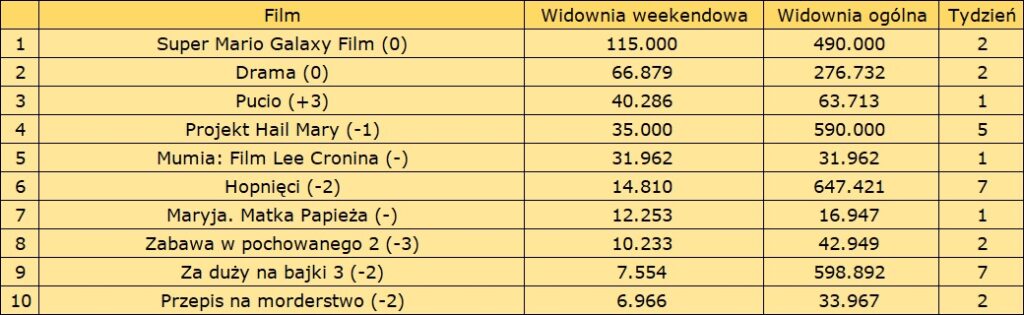 Po drugim weekendzie wyświetlania na koncie Super Mario Galaxy Film mogło znajdować się blisko pół miliona sprzedanych biletów. Notowane wyniki są wyraźnie słabsze niż w przypadku poprzednika. przez cały czas bardzo dobrze radzi sobie Drama, którą zobaczyło już w sumie ponad 300 tys. osób.