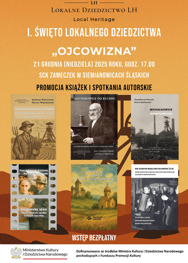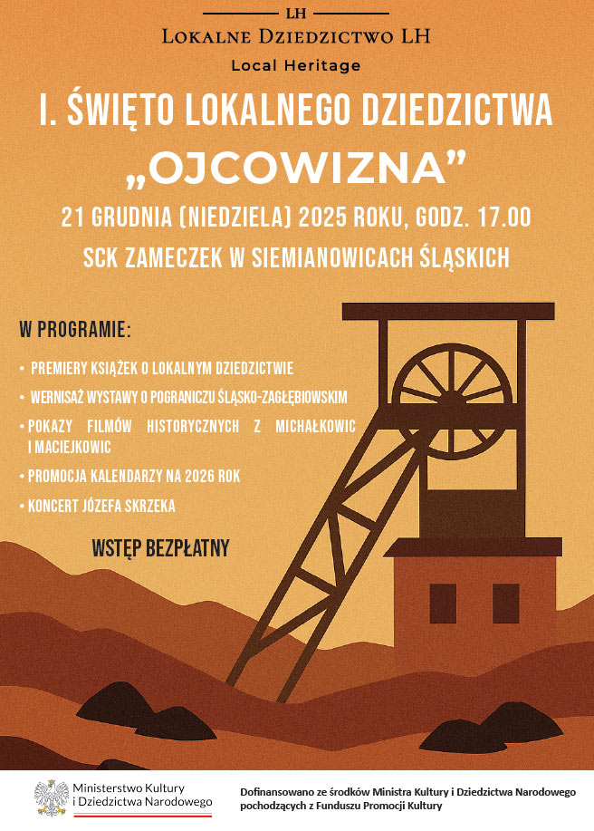 21 grudnia 2025 roku o godzinie 17.00 w SCK Zameczek w Siemianowicach Śląskich (ul. Oświęcimska 1) odbędzie się I. Święto Lokalnego Dziedzictwa „Ojcowizna” – wydarzenie poświęcone historii, pamięci i dziedzictwu „małych ojczyzn”. Organizowane przez firmę Lokalne Dziedzictwo LH wydarzenie ma charakter otwarty i bezpłatny, a jego celem jest integracja środowisk lokalnych wokół wspólnej przeszłości i kultury regionu.
