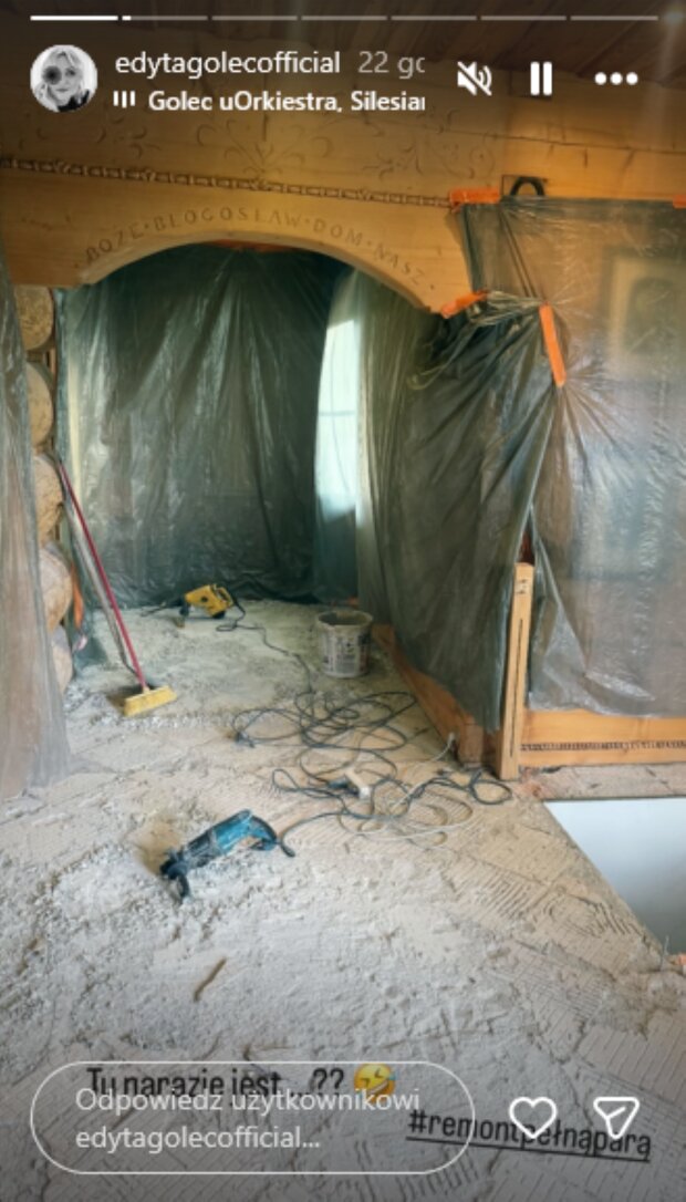 We wtorkowy wieczór Edyta Golec zaskoczyła swoich obserwatorów, publikując na Instagramie kadr, który wyraźnie odbiega od starannie dopracowanych, ciepłych ujęć jej beskidzkiego domu. Tym razem wokalistka pokazała wnętrze w totalnym chaosie: folia ochronna na ścianach, porozstawiane narzędzia, sprzęty remontowe i przestrzeń, która bardziej przypomina plac budowy niż rodzinne gniazdko.