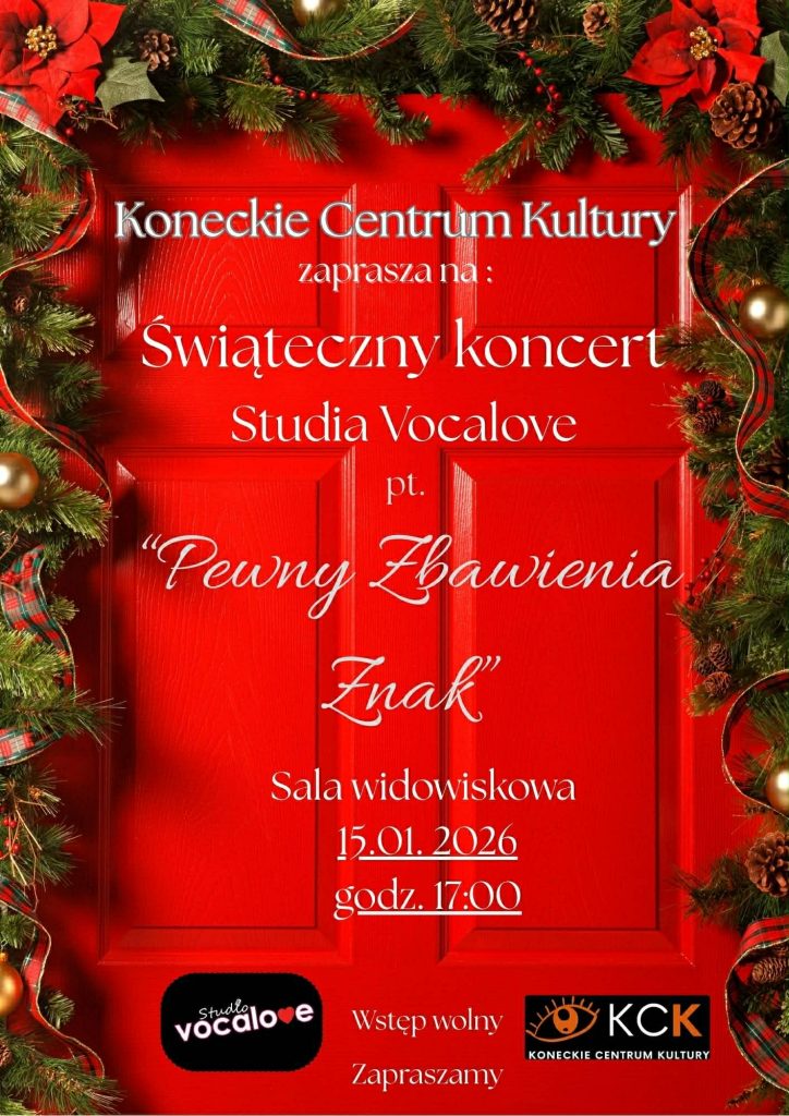 Studio Piosenki Vocalove, prowadzone przez Dominikę Wróbel, zaprasza na świąteczny koncert pod nazwą „Pewny Zbawienia Znak”. Występ rozpocznie się w czwartek 15 stycznia o godzinie 17:00 w sali widowiskowej Koneckiego Centrum Kultury. Wstęp wolny.