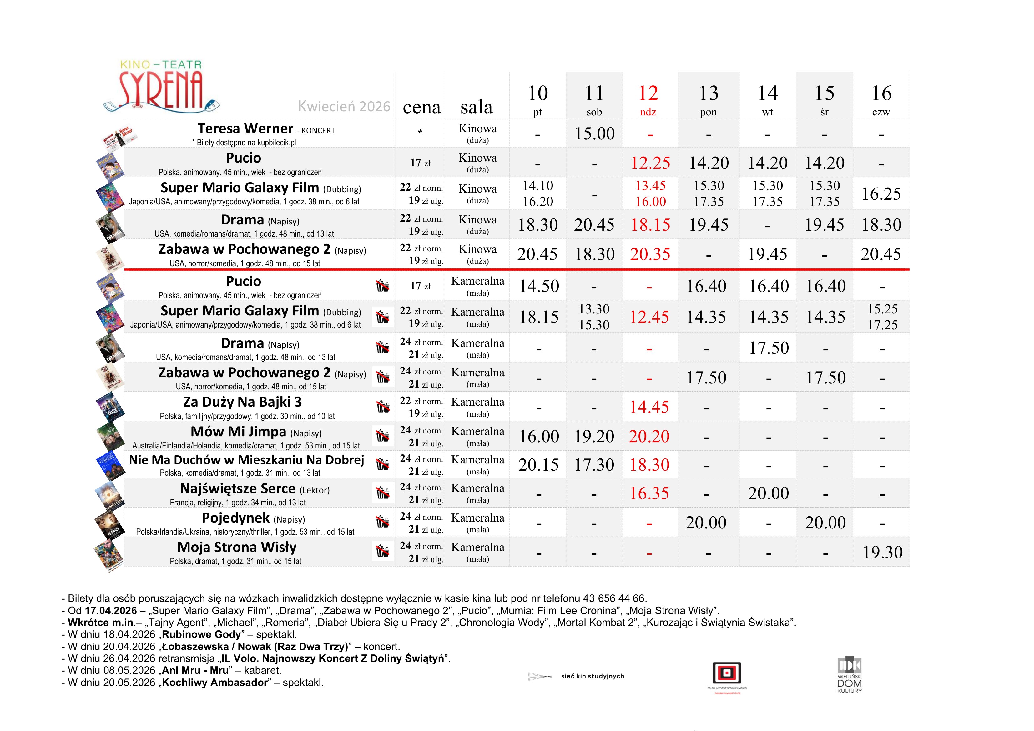 Już w najbliższą sobotę, 11 kwietnia o godzinie 15:00, w dużej sali kinowej wystąpi Teresa Werner. Artystka, znana z takich hitów jak „Dałabym Ci dała” czy „Miłość jest piękna”, przyciąga rzesze fanów w całym kraju.