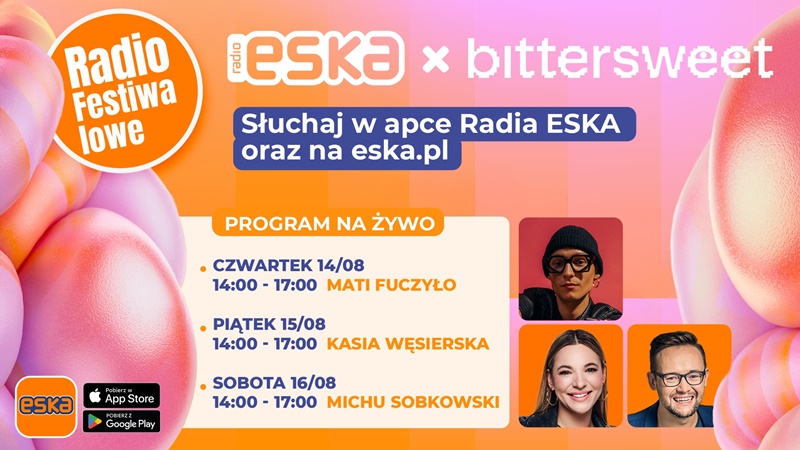 Program ESKA x BitterSweet będzie dostępny podczas wydarzenia za pośrednictwem ESKA Bus i mobilnego studia stacji, a już teraz stacji można słuchać w serwisie eska.pl, w aplikacji mobilnej Radia ESKA oraz na platformie Mediateka.pl.