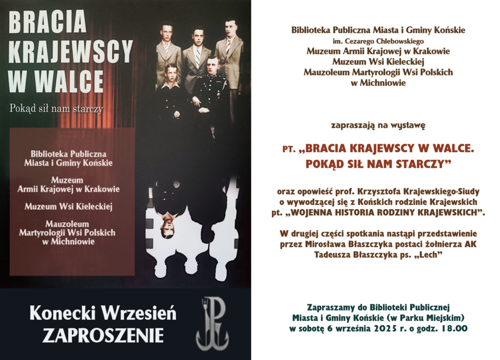 Biblioteka Publiczna Miasta i Gminy Końskie im. Cezarego Chlebowskiego, Muzeum Armii Krajowej w Krakowie, Muzeum Wsi Kieleckiej oraz Mauzoleum Martyrologii Wsi Polskich w Michniowie zapraszają na wyjątkową wystawę pt. „Bracia Krajewscy w walce. Pokąd sił nam starczy”.
