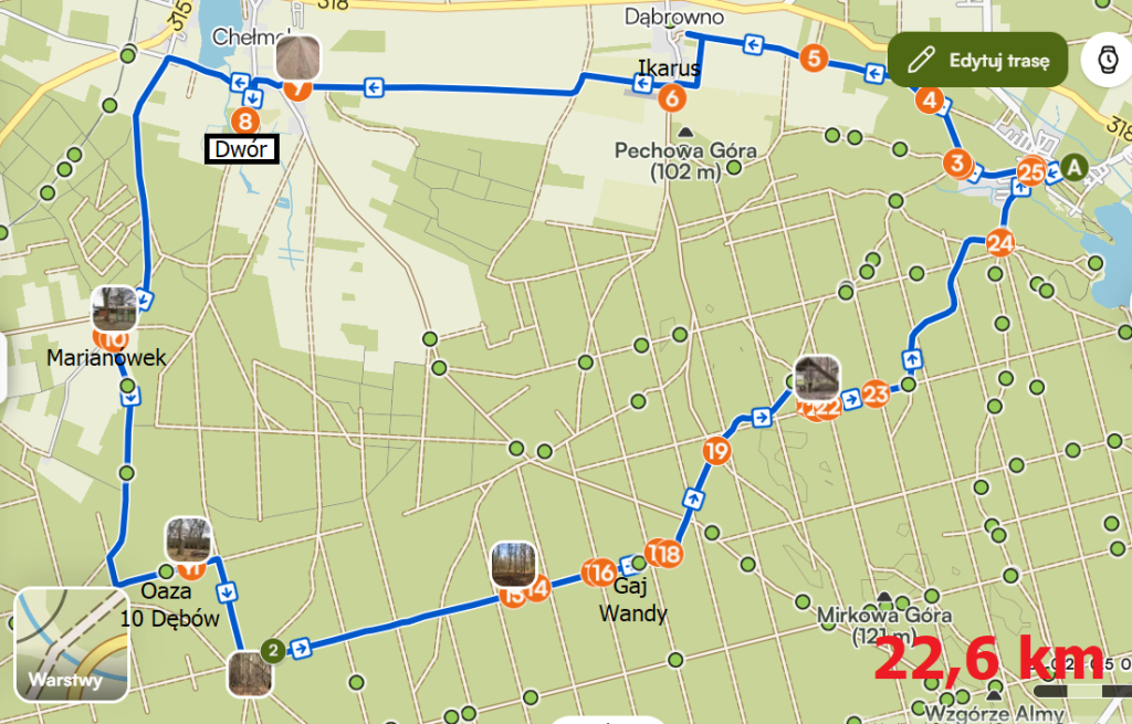 Plan wycieczki zakłada kolejno przejazd do Dąbrowna, Chełmka i Drogoniowa (Marianówka), a następnie duktami leśnymi do tytułowej Oazy 10 Dębów i Gaju Wandy. W programie przewidziana jest m.in. wizyta na lądowisku Lubięcińskiego Stowarzyszenia Lotniczego „Ikarus” w Dąbrownie i zabytkowym dworze w Chełmku.
