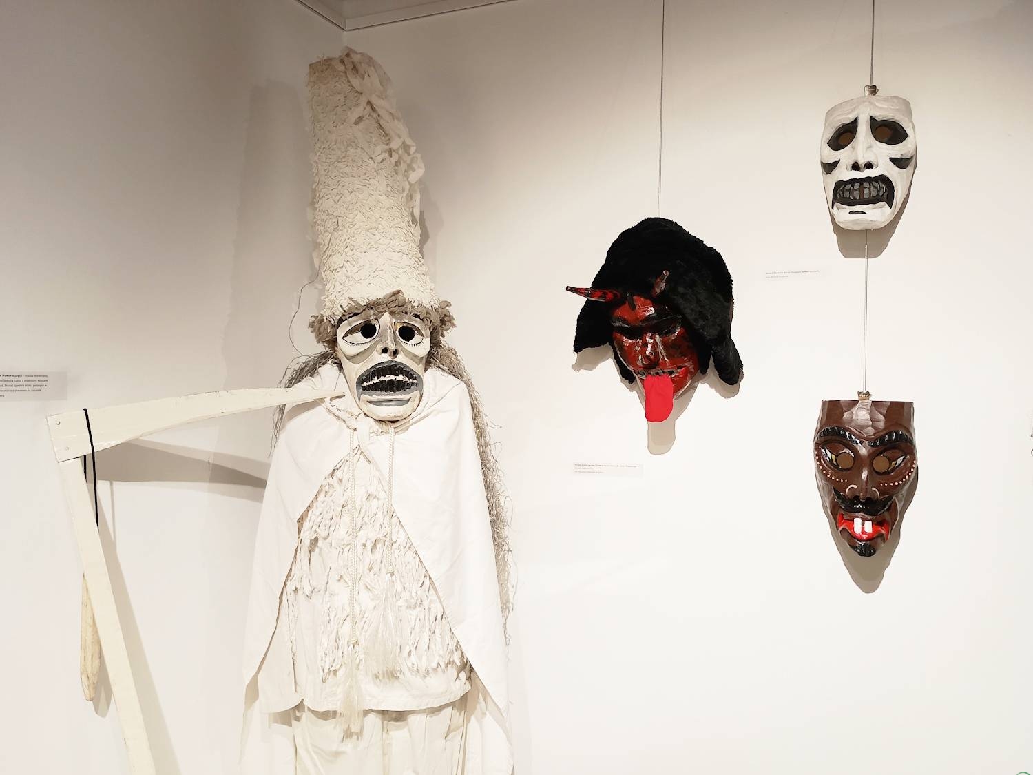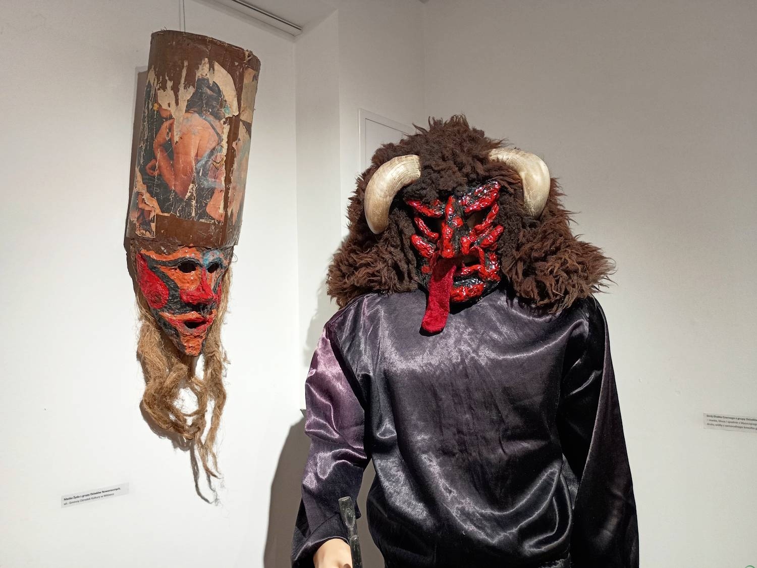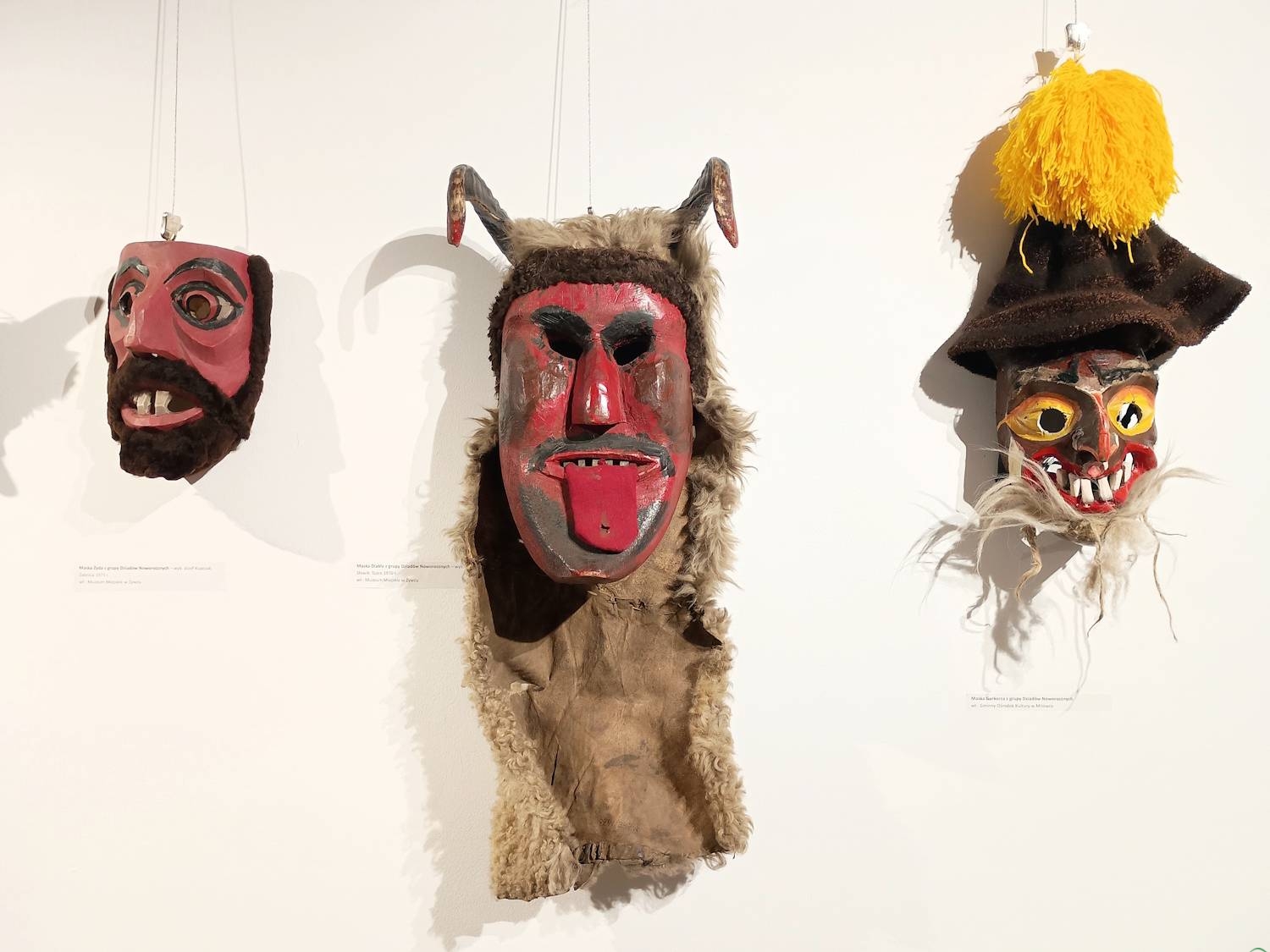 Eksponaty prezentowane na wystawie pochodzą ze zbiorów Muzeum Miejskiego w Żywcu, Muzeum Regionalnego Na Grapie w Jaworzynce, Gminnego Ośrodka Kultury w Milówce oraz zbiorów własnych ich autorów – Zbigniewa Krężeloka zwanego „Poleśnym”, Adriana Mokrysa i Bartłomieja Potasiaka. – Zająłem się rzeźbieniem masek w czasie pandemii i od tego czasu razem z żoną wykonujemy choćby całe stroje dziadowskie. Maski wykonuję z drewna lipowego, a potem maluję je farbami akrylowymi lub olejnymi, a gdy wyschną, zdobię kawałkami materiału czy bibuły – mówi Bartłomiej Potasiak z Cięciny.