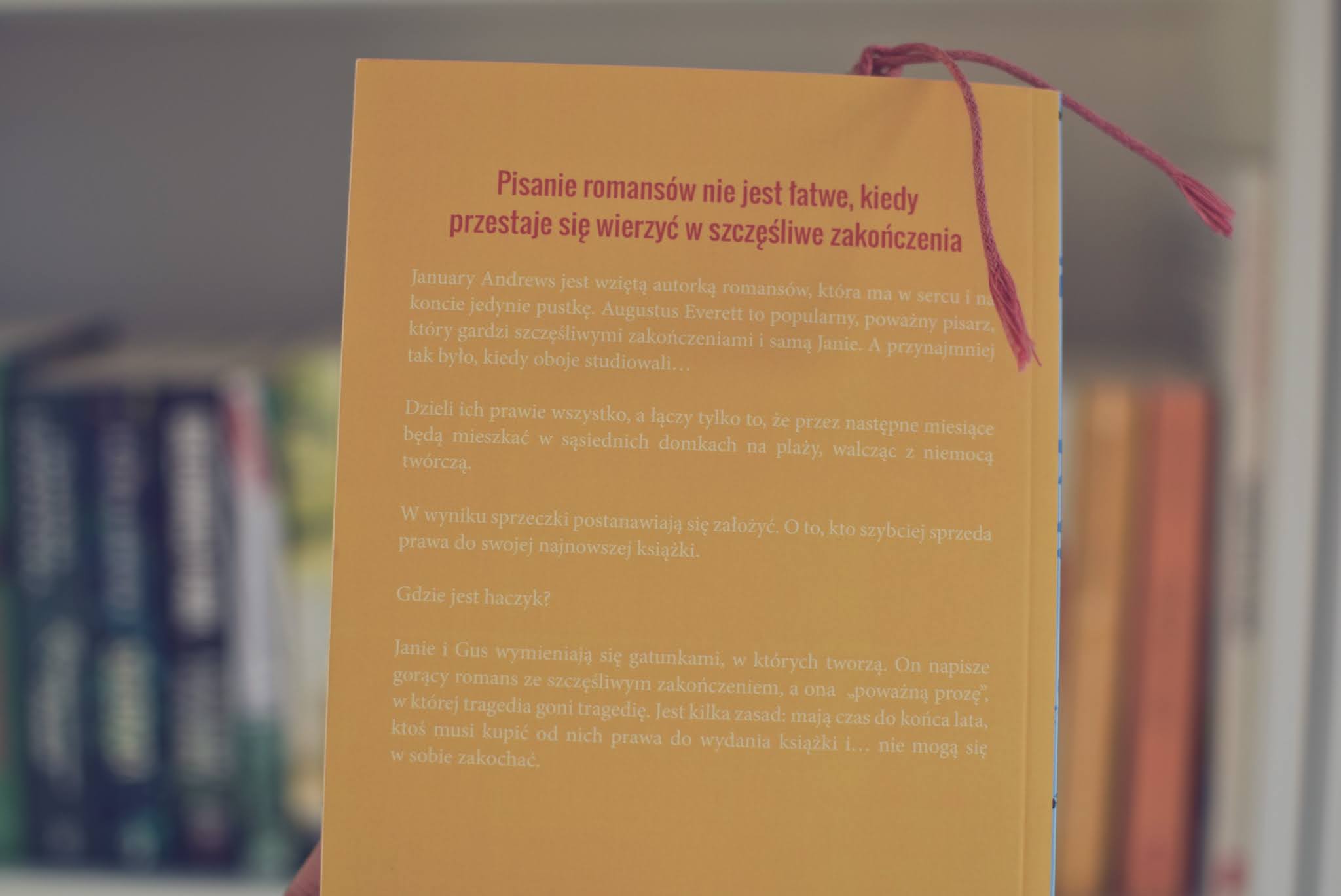 "Beach read" należy do tej kategorii. Jest to lekka pozycja, zahaczająca o trudne problemy, w której główni bohaterowie są ciekawi, jest zabawnie, a cała otoczka fabuły pokazuje, iż można prowadzić akcję statycznie i sprawić by była atrakcyjna.