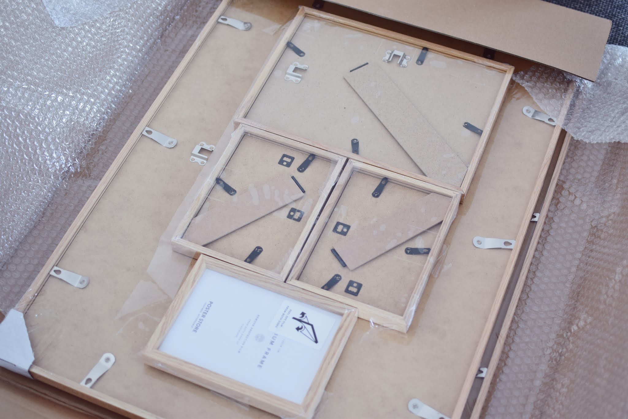 Byłam w szoku, kiedy kurier dwa dni po złożeniu zamówienia zapukał do moich drzwi. Tym bardziej zaskakujące, iż przesyłka przybyła do mnie aż z odległej części Niemiec. Wszystko było bardzo dobrze zapakowane. Każda ramka była w folii, a plakaty razem w ogromnej koszulce. Mniejsze ramki były zafoliowane z większymi, dzięki czemu miały dodatkową ochronę. Byłam zaskoczona jak solidnie wygląda całość i mimo długiej trasy, raczej nic nie mogło się stać. Warto zaznaczyć też, iż każda szybka/plexa w ramce przychodzi do nas z podwójną warstwą folii ochronnej, którą trzeba samemu usunąć. Najlepiej zrobić to już po powieszeniu obrazków. Dzięki temu, podczas wieszania nic się nie pobrudzi, lub uszkodzi. Tak doradził mój narzeczony i stwierdzam, iż mądrze doradził. Po powieszeniu wszystkich obrazków dopiero ściągałam każdy i zdejmowałam z nich folię. Zajęło mi to dosłownie chwilę. Folia odchodzi bez problemu i nie pozostawia śladów.