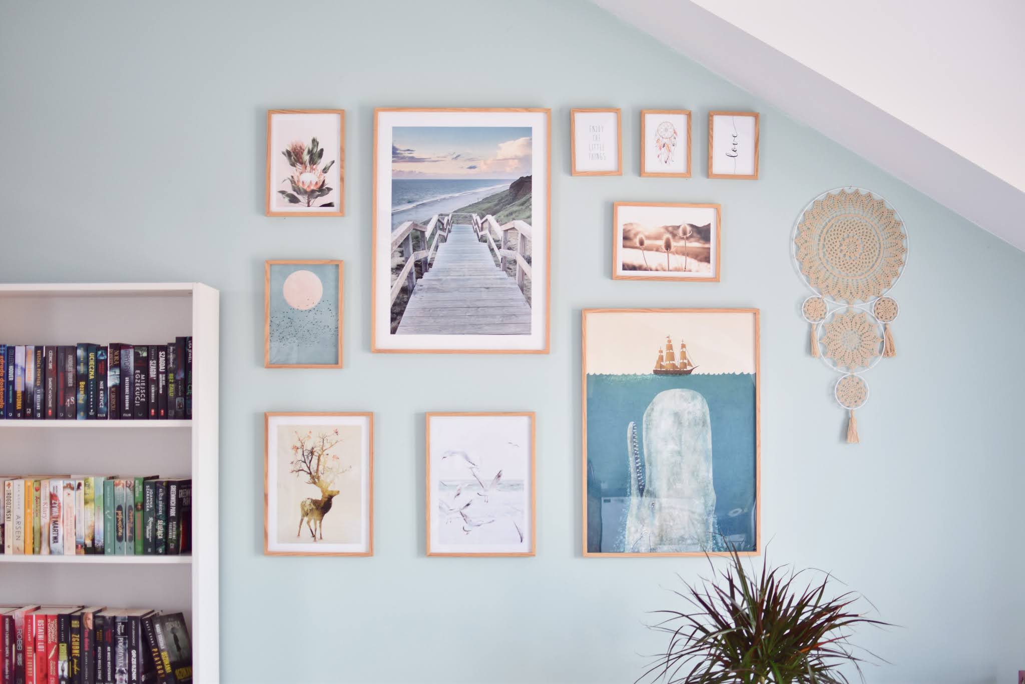Do tej pory wieszałam na ścianie pojedyncze obrazy. Nigdy nie komponowałam i nie miałam pojęcia jak się do tego zabrać. Plakaty do salonu to było zupełnie coś innego. Na szczęście z pomocą przyszedł mi dział inspiracji, w którym po dziewięciu próbach, w końcu znalazłam układ idealny. Ściana w salonie niestety ograniczała mnie metrażem, dlatego musiałam wszystko dopasować tak, by nie musieć za bardzo odsuwać regałów z książkami. Kiedy już wybrałam ułożenie, rozrysowałam je sobie na kartce razem z wymiarami. To istotne, by wiedzieć, który wymiar będzie w jakim miejscu na ścianie. Na pewno ułatwi to tworzenie galerii. Wypisałam w ramkach na kartce wymiary i rozpoczęłam buszowanie. Od razu wiedziałam, iż chcę iść w morskie klimaty w kolorach beżu i niebieskości. W mieszkaniu mam miętową ścianę, ale chciałabym aby kompozycja plakatów pasowała także w przyszłości do innych kolorów ścian i była w miarę uniwersalna. Nie miałam jednak na celu aranżacji obrazów tylko z morskim akcentem.