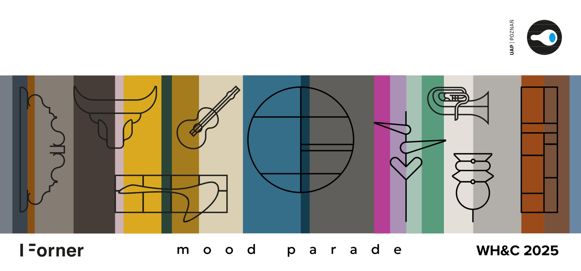 Wystawa „Mood Parade” to trzecia już odsłona współpracy marki FORNER z twórczyniami i twórcami z Uniwersytetu Artystycznego im. Magdaleny Abakanowicz w Poznaniu. Po kuszącym feerią kolorów „Ogrodzie rozkoszy ziemskich” przyszła pora na korowód nastrojów, zamkniętych w dwunastu sytuacjach, z których każda stanowi odrębną kompozycję przestrzenną, opatrzoną anegdotycznym tytułem, inspirującym do osobistej interpretacji tego, co widzimy. Jasne i czytelne skojarzenia funkcjonalne wynikają z charakteru brył, kształtujących poszczególne odcinki lub raczej należałoby rzec: komórki stworzonego na użytek wystawy labiryntu. Bryły mebli skrzyniowych, zaprojektowanych specjalnie na tę okazję przez Mateusza Wróblewskiego, to dopiero początek historii, która, jak przystało na paradę, posiada swoistą chronologię. Jest wprawdzie owa chronologia dość umowna, zależy bowiem od obranego szlaku zwiedzania. Nie to bowiem, aby kształtować wzajemne napięcia czy przyczynowo skutkowość pomiędzy poszczególnymi obszarami, ale by zgrupować i skojarzyć z sobą wybrane elementy, było intencją twórców ekspozycji. Zgrupowanie w dwanaście pozornie autonomicznych sytuacji, porządkuje percepcyjnie gęstwinę form indywidualnych, które wyodrębniają się i uczytelniają dzięki uproszczeniu wzajemnych relacji. A są to oprawy świetlne, formy rzeźbiarskie, design one off i ceramika użytkowa autorstwa zarówno kadry naukowo-dydaktycznej UAP, jak osób studiujących na naszej uczelni. Nieprzypadkowym motywem, otwierającym tę wyjątkową suitę zjawisk przestrzennych, jest panneau złożone z instrumentów muzycznych. Synestezyjne odbieranie rzeczywistości dodatkowo mobilizuje umysł do aktywnego intepretowania odbieranych zjawisk.